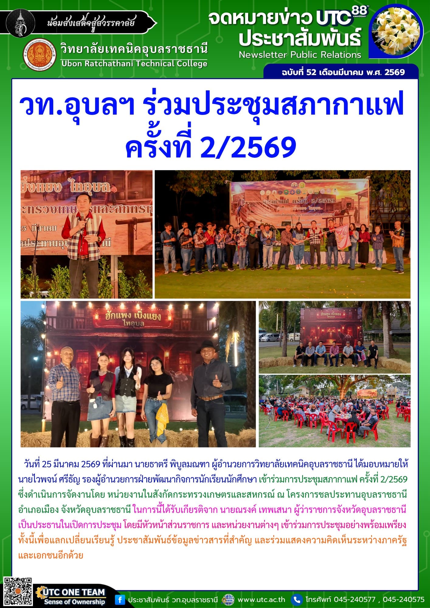 วันที่ 25 มีนาคม 2569 ที่ผ่านมา นายธาตรี พิบูลมณฑา ผู้อำนวยการวิทยาลัยเทคนิคอุบลราชธานี ได้มอบหมายให้ นายไวพจน์ ศรีธัญ รองผู้อำนวยการฝ่ายพัฒนากิจการนักเรียนนักศึกษา เข้าร่วมการประชุมสภากาแฟ ครั้งที่ 2/2569 ซึ่งดำเนินการจัดงานโดย หน่วยงานในสังกัดกระทรวงเกษตรและสหกรณ์ ณ โครงการชลประทานอุบลราชธานี อำเภอเมือง จังหวัดอุบลราชธานีในการนี้ได้รับเกียรติจาก นายณรงค์ เทพเสนา ผู้ว่าราชการจังหวัดอุบลราชธานี เป็นประธานในเปิดการประชุม โดยมีหัวหน้าส่วนราชการ และหน่วยงานต่างๆ เข้าร่วมการประชุมอย่างพร้อมเพรียง ทั้งนี้เพื่อแลกเปลี่ยนเรียนรู้ ประชาสัมพันธ์ข้อมูลข่าวสารที่สำคัญ และร่วมแสดงความคิดเห็นระหว่างภาครัฐและเอกชนอีกด้วย