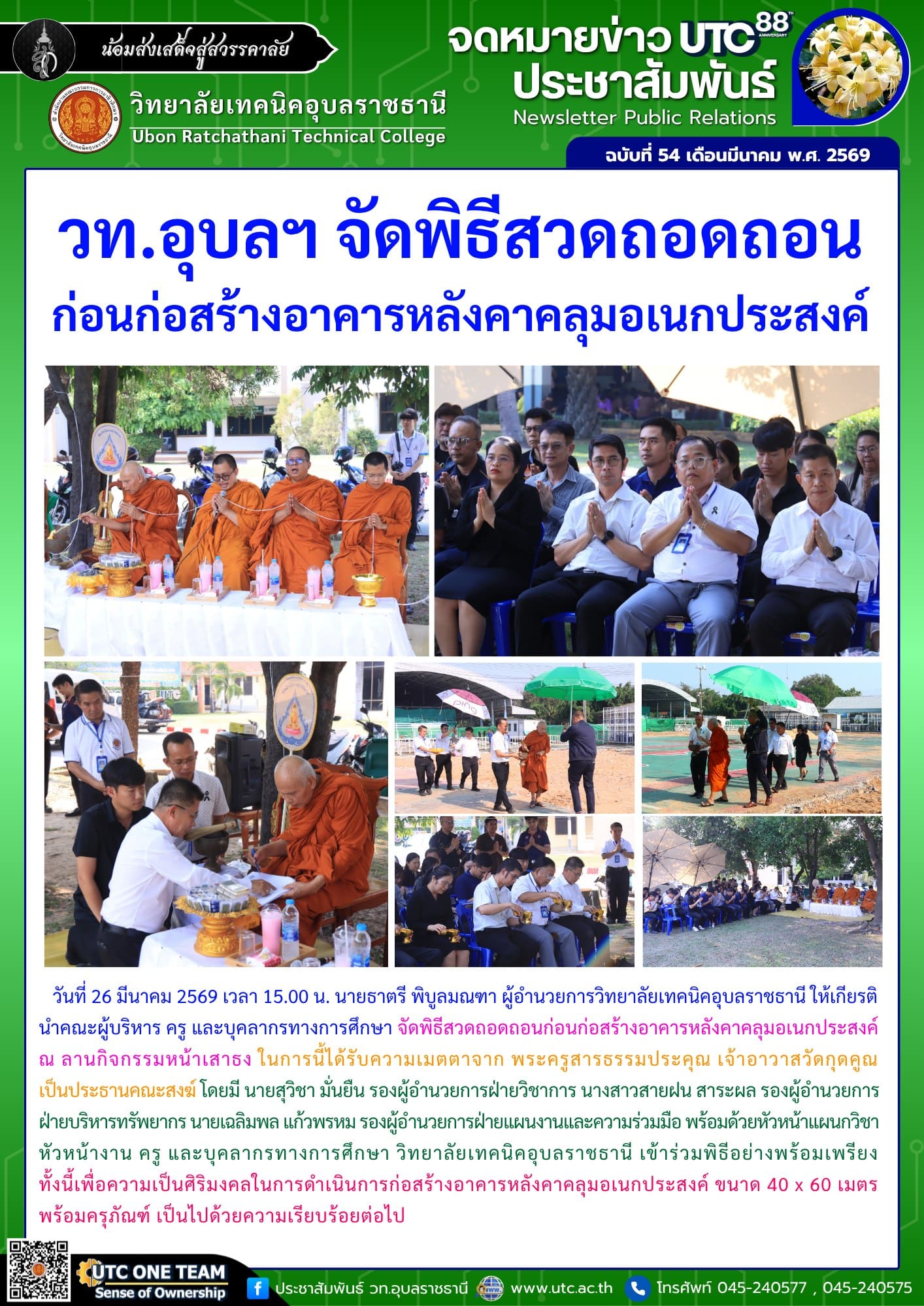 วันที่ 26 มีนาคม 2569 เวลา 15.00 น. นายธาตรี พิบูลมณฑา ผู้อำนวยการวิทยาลัยเทคนิคอุบลราชธานี ให้เกียรตินำคณะผู้บริหาร ครู และบุคลากรทางการศึกษา จัดพิธีสวดถอดถอนก่อนก่อสร้างอาคารหลังคาคลุมอเนก ประสงค์ ณ ลานกิจกรรมหน้าเสาธง ในการนี้ได้รับความเมตตาจาก พระครูสารธรรมประคุณ เจ้าอาวาสวัดกุดคูณ เป็นประธานคณะสงฆ์ โดยมี นายสุวิชา มั่นยืน รองผู้อำนวยการฝ่ายวิชาการ นางสาวสายฝน สาระผล รองผู้อำนวยการฝ่ายบริหารทรัพยากร นายเฉลิมพล แก้วพรหม รองผู้อำนวยการฝ่ายแผนงานและความร่วมมือ พร้อมด้วยหัวหน้าแผนกวิชา หัวหน้างาน ครู และบุคลากรทางการศึกษา วิทยาลัยเทคนิคอุบลราชธานี เข้าร่วมพิธีอย่างพร้อมเพรียง ทั้งนี้เพื่อความเป็นศิริมงคลในการดำเนินการก่อสร้างอาคารหลังคาคลุมอเนกประสงค์ ขนาด 40 x 60 เมตร พร้อมครุภัณฑ์ เป็นไปด้วยความเรียบร้อยต่อไป