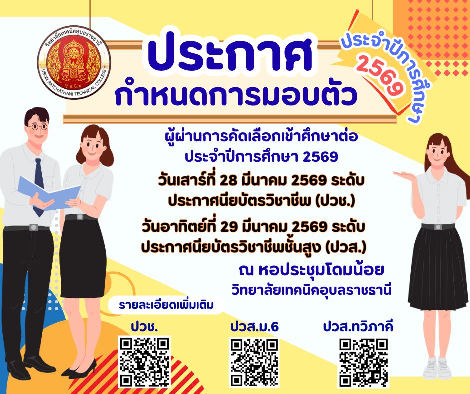 ประกาศวิทยาลัยเทคนิคอุบลราชธานี เรื่อง กำหนดการมอบตัว ผู้ผ่านการคัดเลือกเข้าศึกษาต่อ ประจำปีการศึกษา 2569