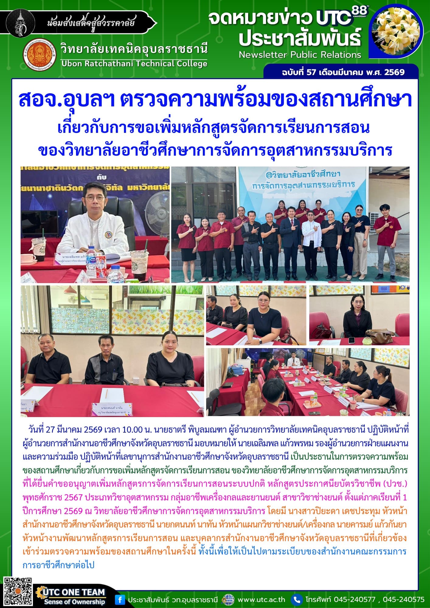 วันที่ 27 มีนาคม 2569 เวลา 10.00 น. นายธาตรี พิบูลมณฑา ผู้อำนวยการวิทยาลัยเทคนิคอุบลราชธานี ปฏิบัติหน้าที่ ผู้อำนวยการสำนักงานอาชีวศึกษาจังหวัดอุบลราชธานี มอบหมายให้ นายเฉลิมพล แก้วพรหม รองผู้อำนวยการฝ่ายแผนงานและความร่วมมือ ปฏิบัติหน้าที่เลขานุการสำนักงานอาชีวศึกษาจังหวัดอุบลราชธานี เป็นประธานในการตรวจความพร้อมของสถานศึกษาเกี่ยวกับการขอเพิ่มหลักสูตรจัดการเรียนการสอน ของวิทยาลัยอาชีวศึกษาการจัดการอุตสาหกรรมบริการ ที่ได้ยื่นคำขออนุญาตเพิ่มหลักสูตรการจัดการเรียนการสอนระบบปกติ หลักสูตรประกาศนียบัตรวิชาชีพ (ปวช.) พุทธศักราช 2567 ประเภทวิชาอุตสาหกรรม กลุ่มอาชีพเครื่องกลและยานยนต์ สาขาวิชาช่างยนต์ ตั้งแต่ภาคเรียนที่ 1 ปีการศึกษา 2569 ณ วิทยาลัยอาชีวศึกษาการจัดการอุตสาหกรรมบริการ โดยมี นางสาวปิยะดา เดชประทุม หัวหน้าสำนักงานอาชีวศึกษาจังหวัดอุบลราชธานี นายกตนนท์ นาทัน หัวหน้าแผนกวิชาช่างยนต์/เครื่องกล นายคารมย์ แก้วกันยา หัวหน้างานพัฒนาหลักสูตรการเรียนการสอน และบุคลากรสำนักงานอาชีวศึกษาจังหวัดอุบลราชธานีที่เกี่ยวข้อง เข้าร่วมตรวจความพร้อมของสถานศึกษาในครั้งนี้ ทั้งนี้เพื่อให้เป็นไปตามระเบียบของสำนักงานคณะกรรมการการอาชีวศึกษาต่อไป