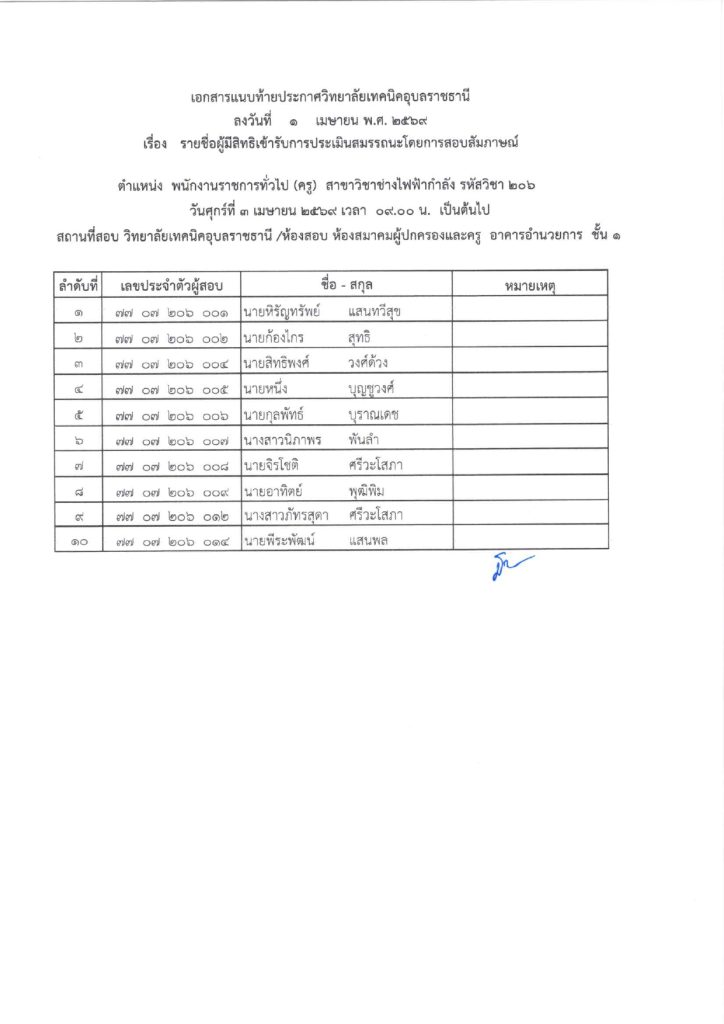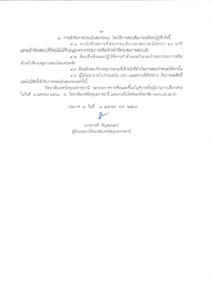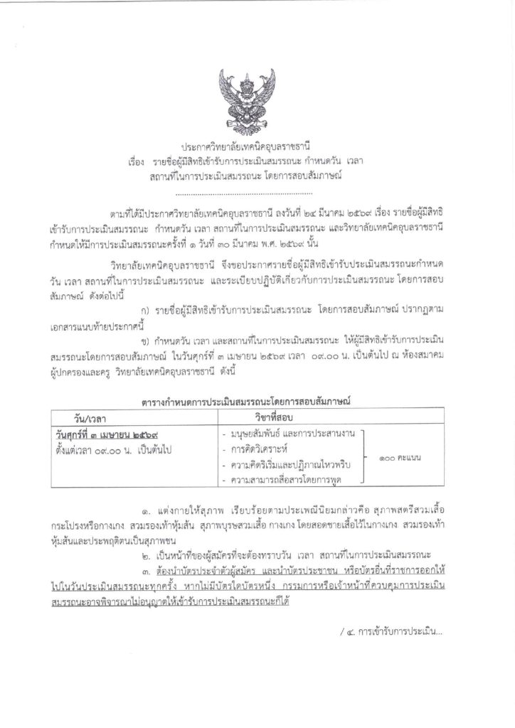 ประกาศวิทยาลัยเทคนิคอุบลราชธานี เรื่อง รายชื่อผู้มีสิทธิ์เข้ารับการประเมินสมรรถนะ กำหนดวัน เวลา สถานที่ในการประเมินสมรรถนะ โดยการสอบสัมภาษณ์ ตำแหน่ง พนักงานราชการทั่วไป (ครู)