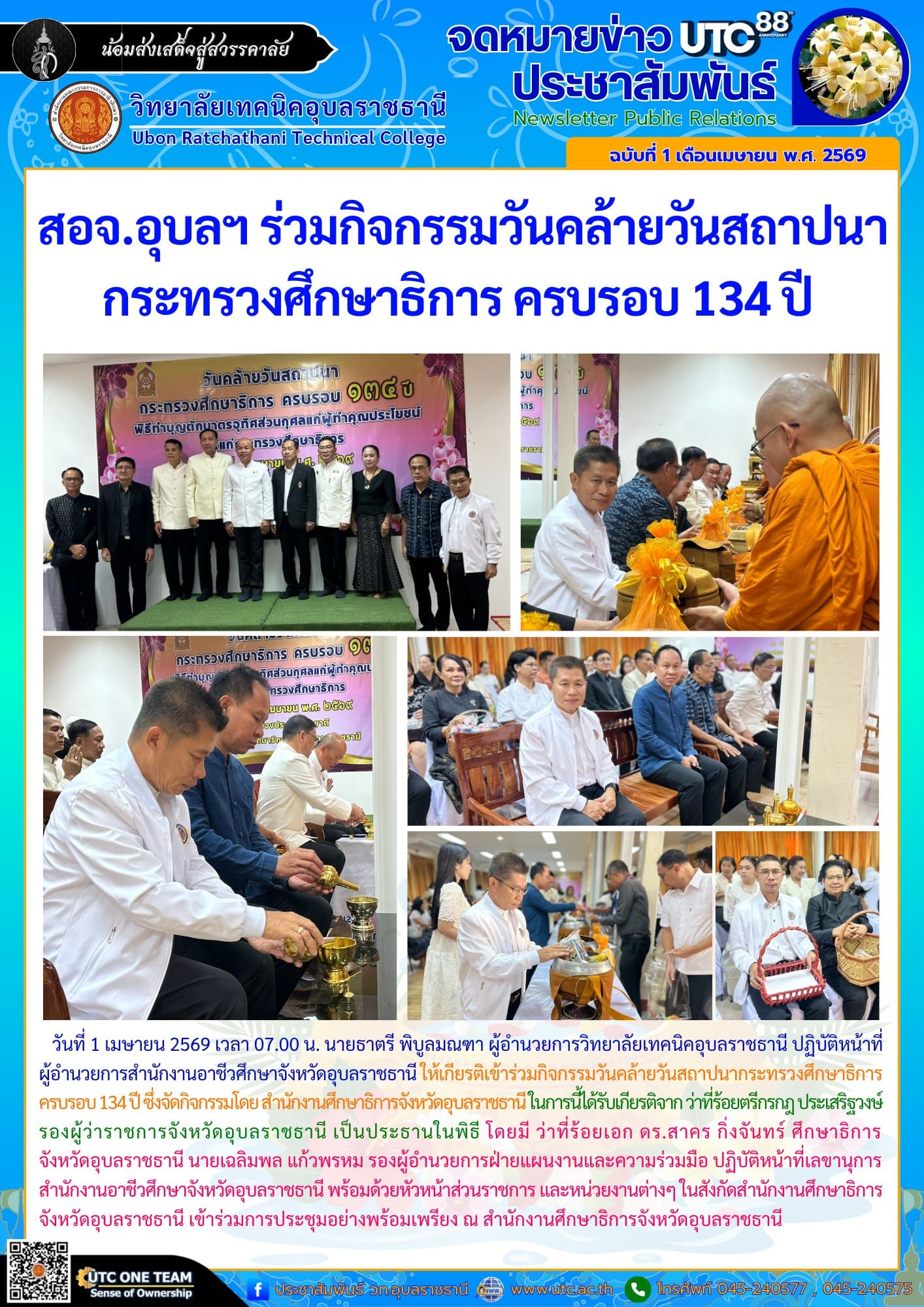 สอจ.อุบลฯ ร่วมกิจกรรมวันคล้ายวันสถาปนากระทรวงศึกษาธิการ ครบรอบ 134 ปี