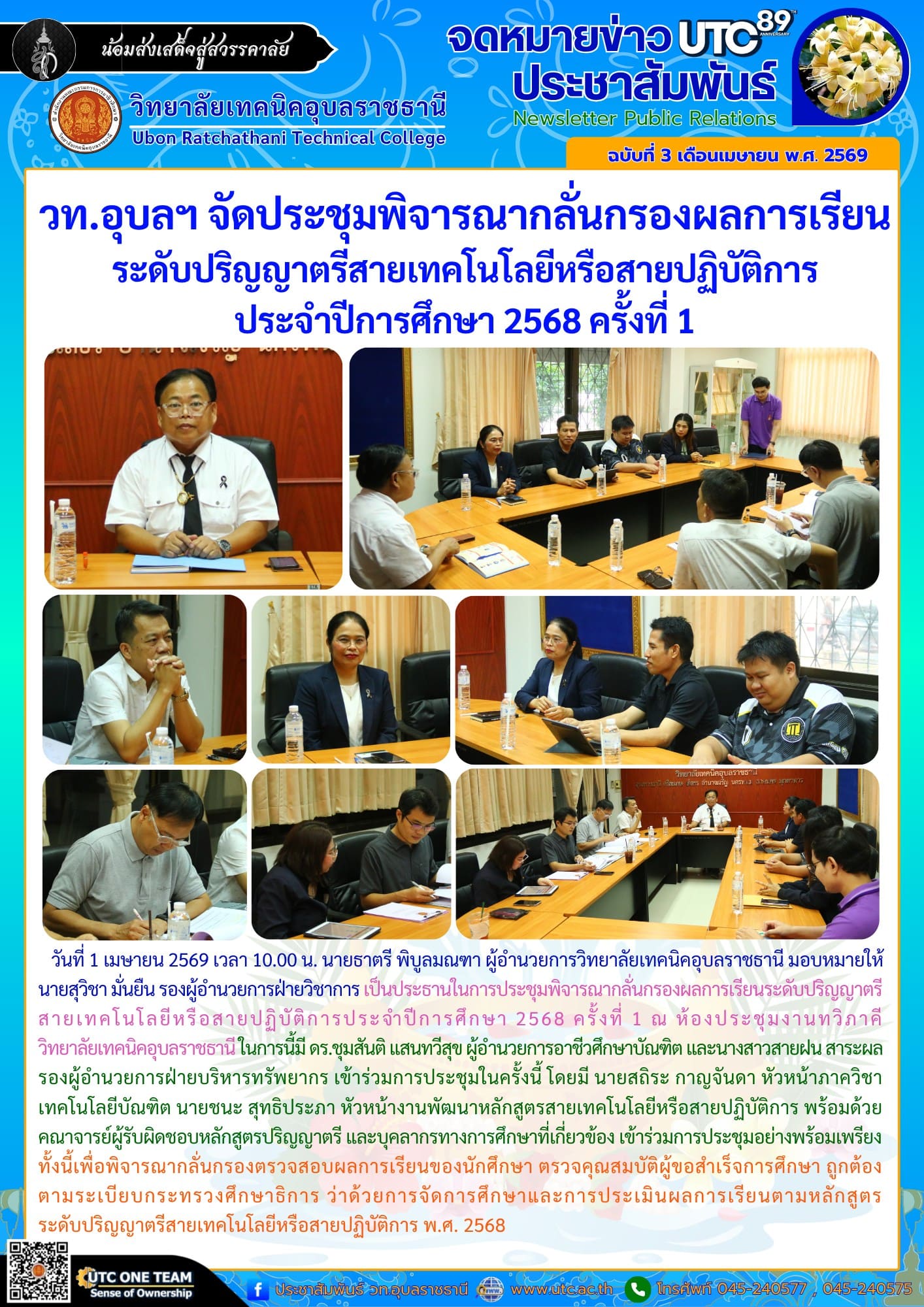 วันที่ 1 เมษายน 2569 เวลา 10.00 น. นายธาตรี พิบูลมณฑา ผู้อำนวยการวิทยาลัยเทคนิคอุบลราชธานี มอบหมายให้ นายสุวิชา มั่นยืน รองผู้อำนวยการฝ่ายวิชาการ เป็นประธานในการประชุมพิจารณากลั่นกรองผลการเรียนระดับปริญญาตรีสายเทคโนโลยีหรือสายปฏิบัติการประจำปีการศึกษา 2568 ครั้งที่ 1ณ ห้องประชุมงานทวิภาคี วิทยาลัยเทคนิคอุบลราชธานี ในการนี้มี ดร.ชุมสันติ แสนทวีสุข ผู้อำนวยการอาชีวศึกษาบัณฑิต และนางสาวสายฝน สาระผล รองผู้อำนวยการฝ่ายบริหารทรัพยากร เข้าร่วมการประชุมในครั้งนี้ โดยมี นายสถิระ กาญจันดา หัวหน้าภาควิชาเทคโนโลยีบัณฑิต นายชนะ สุทธิประภา หัวหน้างานพัฒนาหลักสูตรสายเทคโนโลยีหรือสายปฏิบัติการ พร้อมด้วยคณาจารย์ผู้รับผิดชอบหลักสูตรปริญญาตรี และบุคลากรทางการศึกษาที่เกี่ยวข้อง เข้าร่วมการประชุมอย่างพร้อมเพรียง ทั้งนี้เพื่อพิจารณากลั่นกรองตรวจสอบผลการเรียนของนักศึกษา ตรวจคุณสมบัติผู้ขอสำเร็จการศึกษา ถูกต้องตามระเบียบกระทรวงศึกษาธิการ ว่าด้วยการจัดการศึกษาและการประเมินผลการเรียนตามหลักสูตรระดับปริญญาตรีสายเทคโนโลยีหรือสายปฏิบัติการ พ.ศ. ๒๕๖๘