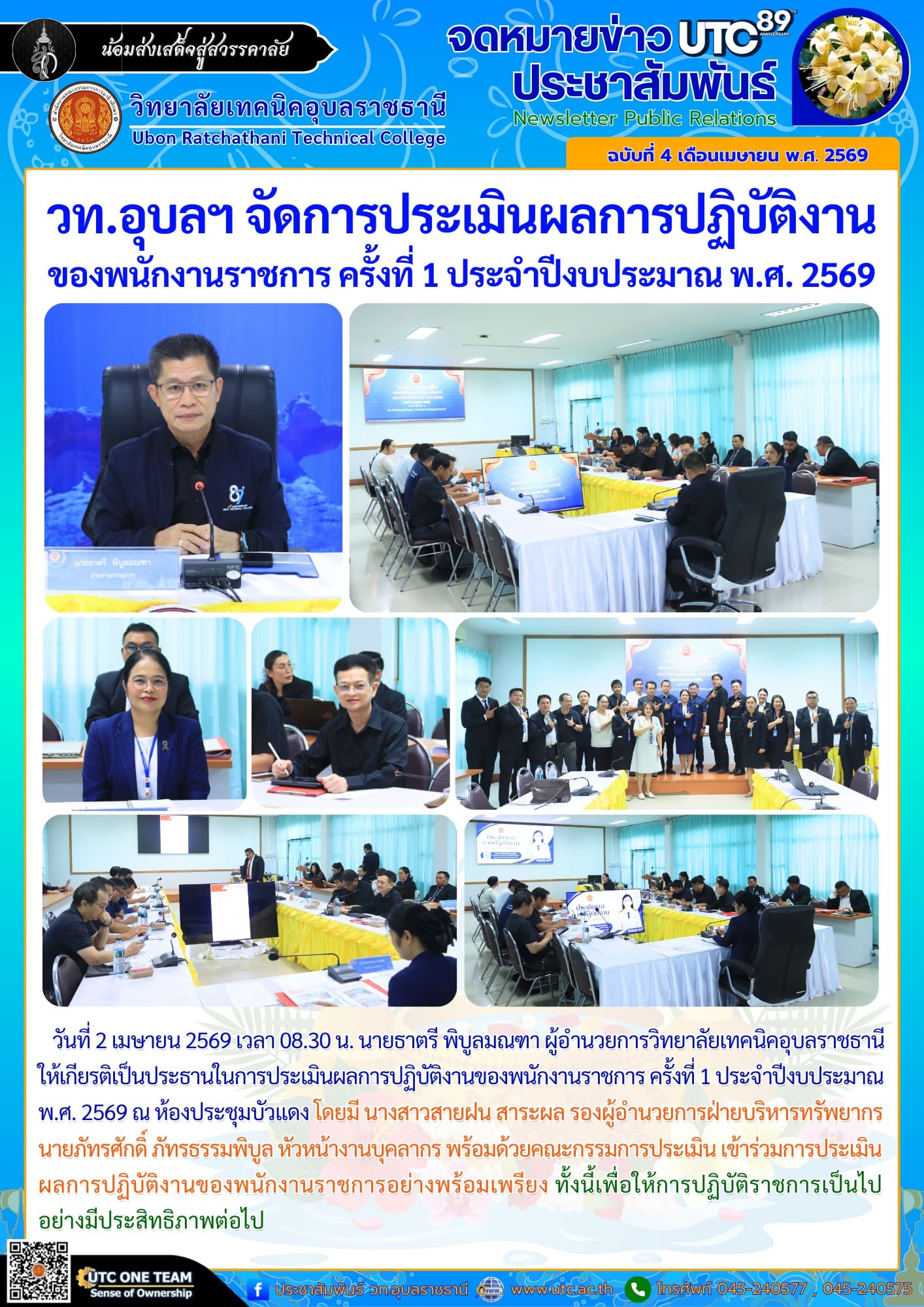 วันที่ 2 เมษายน 2569 เวลา 08.30 น. นายธาตรี พิบูลมณฑา ผู้อำนวยการวิทยาลัยเทคนิคอุบลราชธานี ให้เกียรติเป็นประธานในการประเมินผลการปฏิบัติงานของพนักงานราชการ ครั้งที่ 1 ประจำปีงบประมาณ พ.ศ. 2569 ณ ห้องประชุมบัวแดง โดยมี นางสาวสายฝน สาระผล รองผู้อำนวยการฝ่ายบริหารทรัพยากร นายภัทรศักดิ์ ภัทรธรรมพิบูล หัวหน้างานบุคลากร พร้อมด้วยคณะกรรมการประเมิน เข้าร่วมการประเมินผลการปฏิบัติงานของพนักงานราชการอย่างพร้อมเพรียง ทั้งนี้เพื่อให้การปฏิบัติราชการเป็นไปอย่างมีประสิทธิภาพต่อไป