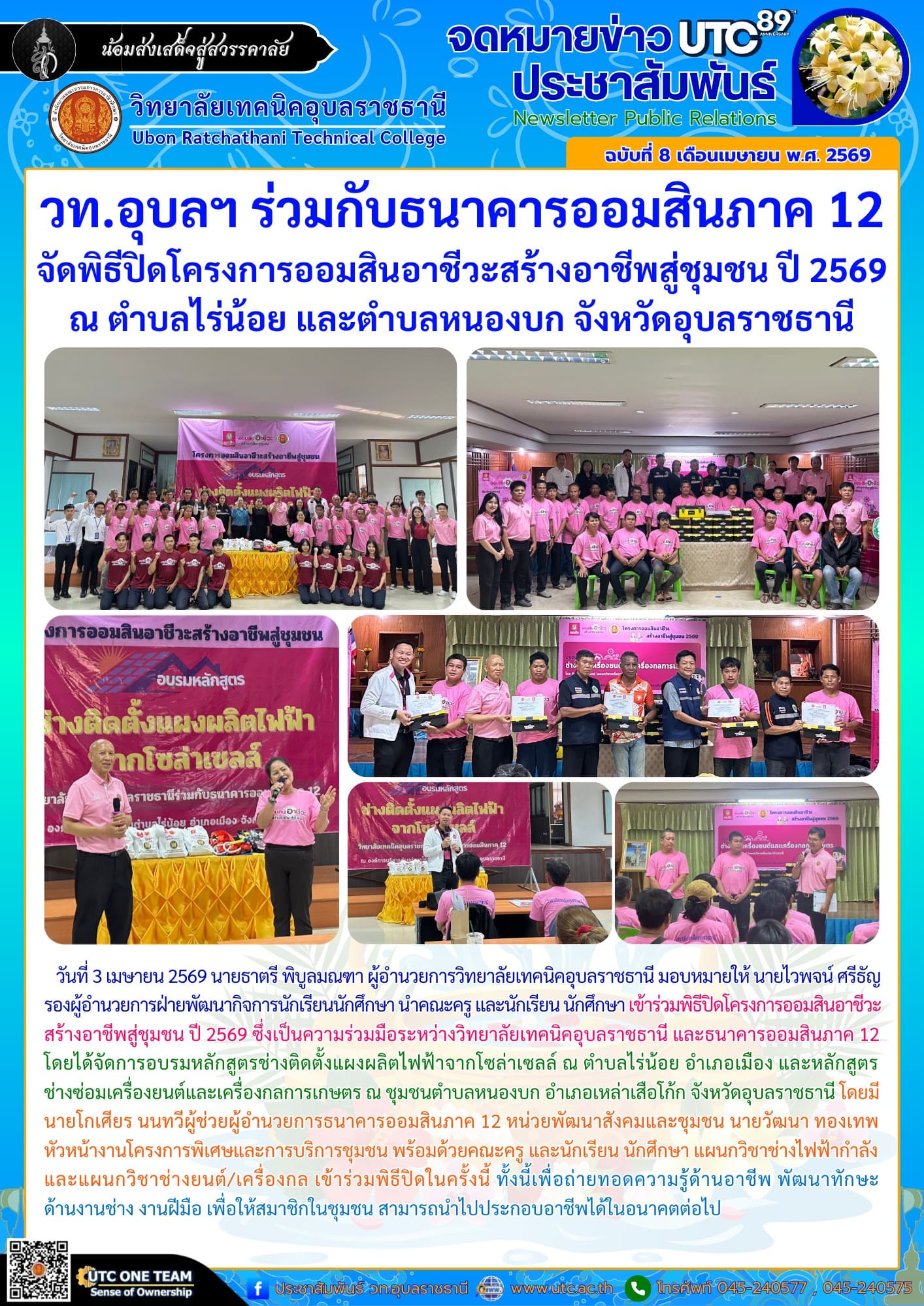 วันที่ 3 เมษายน 2569 นายธาตรี พิบูลมณฑา ผู้อำนวยการวิทยาลัยเทคนิคอุบลราชธานี มอบหมายให้ นายไวพจน์ ศรีธัญ รองผู้อำนวยการฝ่ายพัฒนากิจการนักเรียนนักศึกษา นำคณะครู และนักเรียน นักศึกษา เข้าร่วมพิธีปิดโครงการออมสินอาชีวะสร้างอาชีพสู่ชุมชน ปี 2569 ซึ่งเป็นความร่วมมือระหว่างวิทยาลัยเทคนิคอุบลราชธานี และธนาคารออมสินภาค 12 โดยได้จัดการอบรมหลักสูตรช่างติดตั้งแผงผลิตไฟฟ้าจากโซล่าเซลล์ ณ ตำบลไร่น้อย อำเภอเมือง และหลักสูตรช่างซ่อมเครื่องยนต์และเครื่องกลการเกษตร ณ ชุมชนตำบลหนองบก อำเภอเหล่าเสือโก้ก จังหวัดอุบลราชธานี โดยมี นายโกเศียร นนทวีผู้ช่วยผู้อำนวยการธนาคารออมสินภาค 12 หน่วยพัฒนาสังคมและชุมชน นายวัฒนา ทองเทพ หัวหน้างานโครงการพิเศษและการบริการชุมชน พร้อมด้วยคณะครู และนักเรียน นักศึกษา แผนกวิชาช่างไฟฟ้ากำลัง และแผนกวิชาช่างยนต์/เครื่องกล เข้าร่วมการดำเนินโครงการในครั้งนี้ ทั้งนี้เพื่อถ่ายทอดความรู้ด้านอาชีพ พัฒนาทักษะด้านงานช่าง งานฝีมือ เพื่อให้สมาชิกในชุมชน สามารถนำไปประกอบอาชีพได้ในอนาคตต่อไป