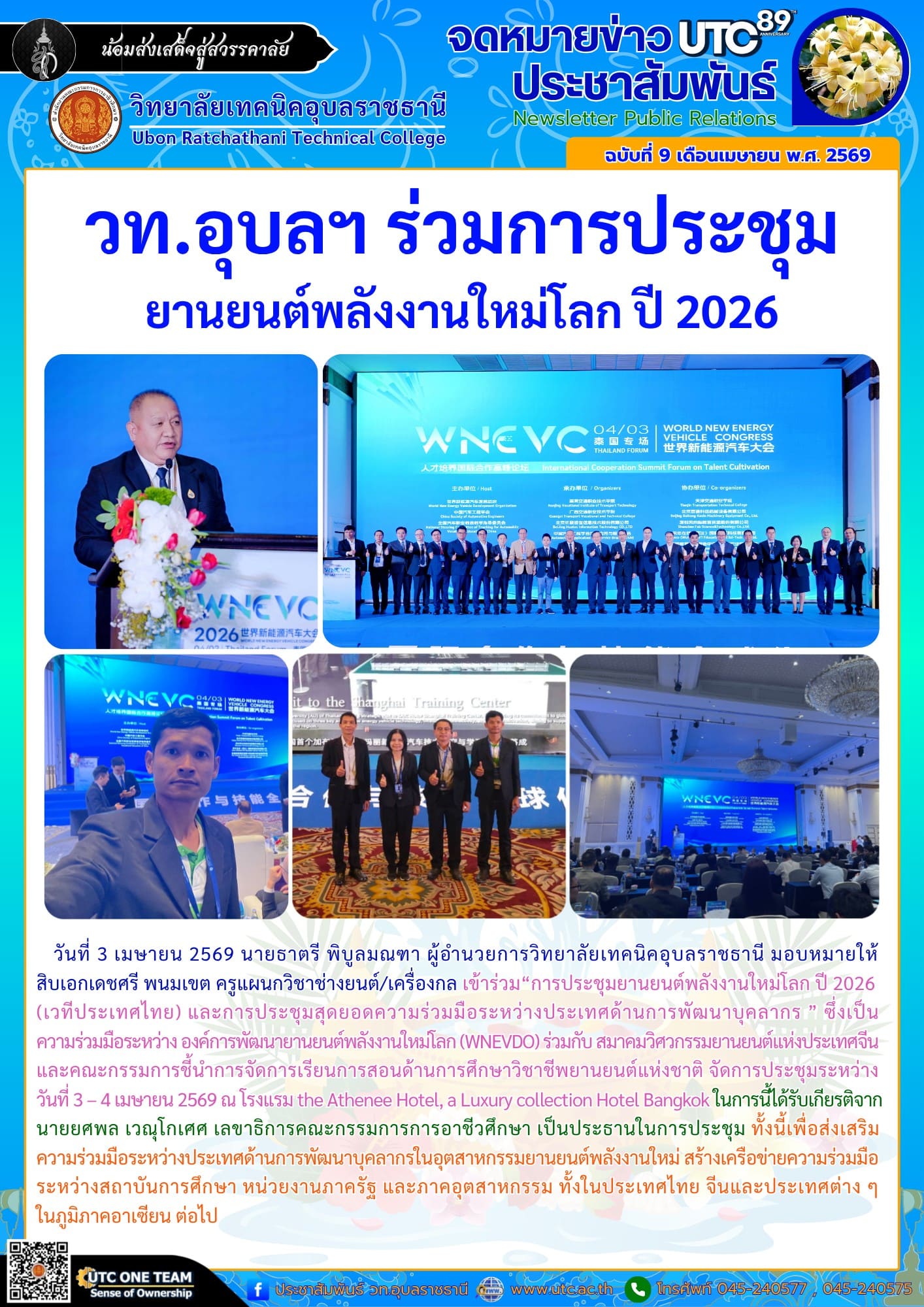 วันที่ 3 เมษายน 2569 นายธาตรี พิบูลมณฑา ผู้อำนวยการวิทยาลัยเทคนิคอุบลราชธานี มอบหมายให้ สิบเอกเดชศรี พนมเขต ครูแผนกวิชาช่างยนต์/เครื่องกล “ การประชุมยานยนต์พลังงานใหม่โลก ปี 2026 (เวทีประเทศไทย) และการประชุมสุดยอดความร่วมมือระหว่างประเทศด้านการพัฒนาบุคลากร ” ซึ่งเป็นความร่วมมือระหว่าง องค์การพัฒนายานยนต์พลังงานใหม่โลก (WNEVDO) ร่วมกับ สมาคมวิศวกรรมยานยนต์แห่งประเทศจีน และคณะกรรมการชี้นำการจัดการเรียนการสอนด้านการศึกษาวิชาชีพยานยนต์แห่งชาติ จัดการประชุมระหว่างวันที่ 3 – 4 เมษายน 2569 ณ โรงแรม the Athenee Hotel, a Luxury collection Hotel Bangkok ในการนี้ได้รับเกียรติจาก นายยศพล เวณุโกเศศ เลขาธิการคณะกรรมการการอาชีวศึกษา เป็นประธานในการประชุม ทั้งนี้เพื่อส่งเสริมความร่วมมือระหว่างประเทศด้านการพัฒนาบุคลากรในอุตสาหกรรมยานยนต์พลังงานใหม่ สร้างเครือข่ายความร่วมมือระหว่างสถาบันการศึกษา หน่วยงานภาครัฐ และภาคอุตสาหกรรม ทั้งในประเทศไทย จีนและประเทศต่าง ๆ ในภูมิภาคอาเซียน ต่อไป