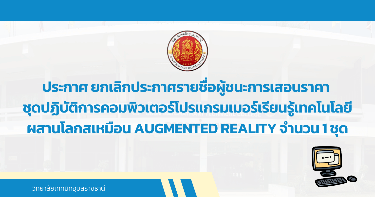 ประกาศ ยกเลิกประกาศรายชื่อผู้ชนะการเสอนราคา ชุดปฏิบัติการคอมพิวเตอร์โปรแกรมเมอร์เรียนรู้เทคโนโลยีผสานโลกสเหมือน Augmented Reality จำนวน 1 ชุด