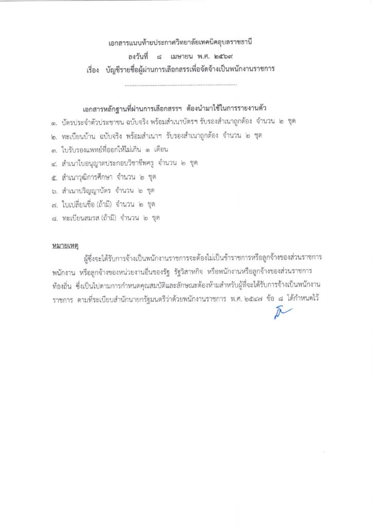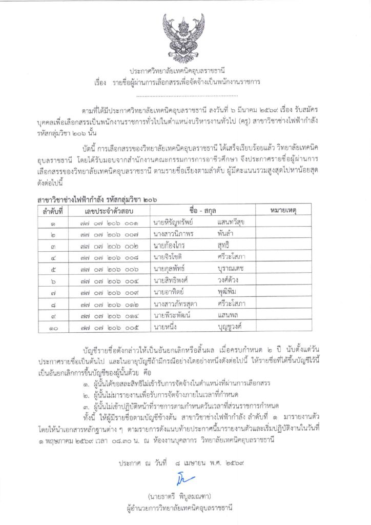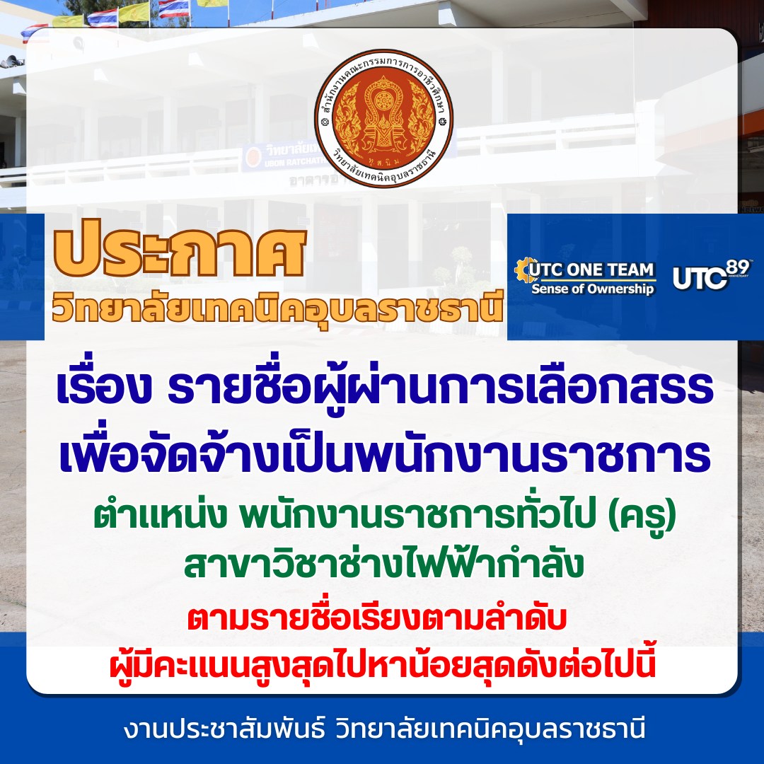 ประกาศวิทยาลัยเทคนิคอุบลราชธานี เรื่อง รายชื่อผู้ผ่านการเลือกสรรเพื่อจัดจ้างเป็นพนักงานราชการ ตำแหน่ง พนักงานราชการทั่วไป (ครู)
