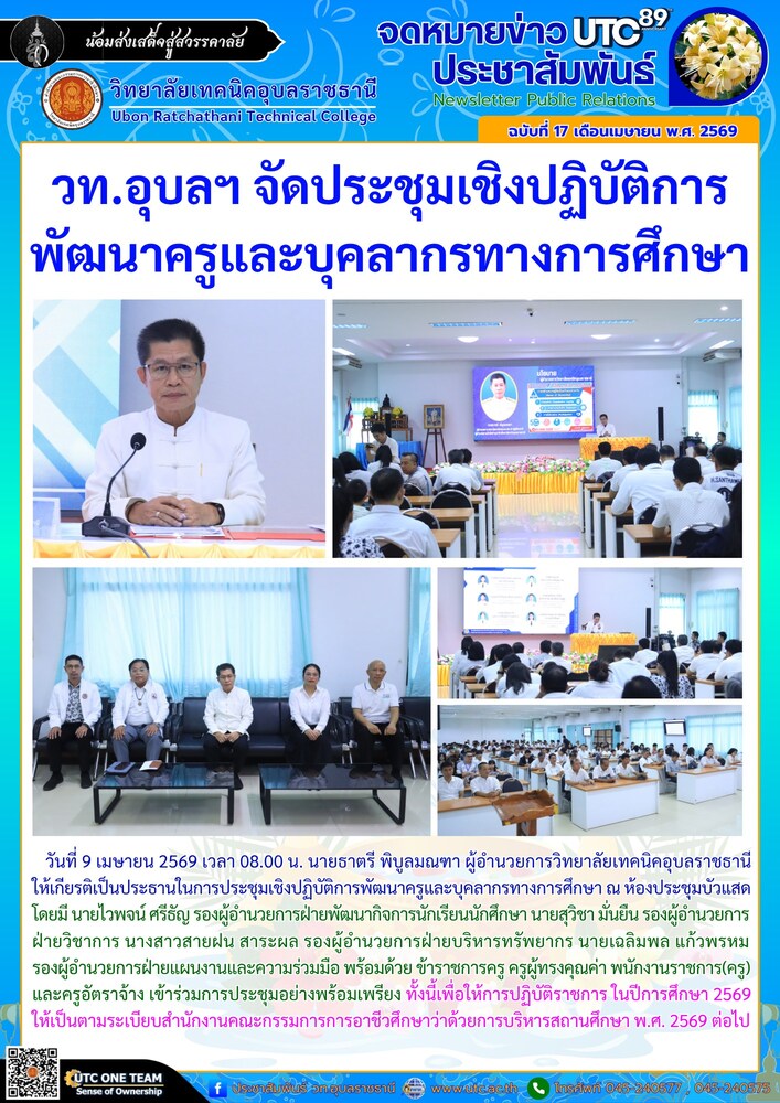 วันที่ 9 เมษายน 2569 เวลา 08.00 น. นายธาตรี พิบูลมณฑา ผู้อำนวยการวิทยาลัยเทคนิคอุบลราชธานี ให้เกียรติเป็นประธานในการประชุมเชิงปฏิบัติการพัฒนาครูและบุคลากรทางการศึกษา ณ ห้องประชุมบัวแสด โดยมีนายไวพจน์ ศรีธัญ รองผู้อำนวยการฝ่ายพัฒนากิจการนักเรียนนักศึกษา นายสุวิชา มั่นยืน รองผู้อำนวยการฝ่ายวิชาการ นางสาวสายฝน สาระผล รองผู้อำนวยการฝ่ายบริหารทรัพยากร นายเฉลิมพล แก้วพรหม รองผู้อำนวยการฝ่ายแผนงานและความร่วมมือ พร้อมด้วย ข้าราชการครู ครูผู้ทรงคุณค่า พนักงานราชการ(ครู) และครูอัตราจ้าง เข้าร่วมการประชุมอย่างพร้อมเพรียง ทั้งนี้เพื่อให้การปฏิบัติราชการ ในปีการศึกษา 2569 ให้เป็นตามระเบียบสำนักงานคณะกรรมการการอาชีวศึกษาว่าด้วยการบริหารสถานศึกษา พ.ศ. 2569 ต่อไป