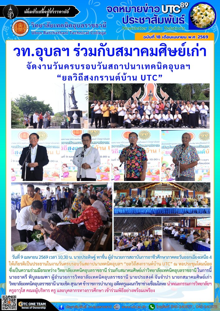 วันที่ 9 เมษายน 2569 เวลา 10.30 น. นายประดิษฐ์ พาชื่น ผู้อำนวยการสถาบันการอาชีวศึกษาภาคตะวันออกเฉียงเหนือ 4 ให้เกียรติเป็นประธานในงานวันครบรอบวันสถาปนาเทคนิคอุบลฯ “ยลวิถีสงกรานต์บ้าน UTC” ณ หอประชุมโดมน้อย ซึ่งเป็นความร่วมมือระหว่าง วิทยาลัยเทคนิคอุบลราชธานี ร่วมกับสมาคมศิษย์เก่าวิทยาลัยเทคนิคอุบลราชธานี ในการนี้ นายธาตรี พิบูลมณฑา ผู้อำนวยการวิทยาลัยเทคนิคอุบลราชธานี นายประสงค์ จันจำปา นายกสมาคมศิษย์เก่าวิทยาลัยเทคนิคอุบลราชธานี นายเชิด สุรมาศ ข้าราชการบำนาญ อดีตครูแผนกวิชาช่างเชื่อมโลหะ นำคณะกรรมการวิทยาลัยฯ ครูอาวุโส คณะผู้บริหาร ครู และบุคลากรทางการศึกษา เข้าร่วมพิธีอย่างพร้อมเพรียง