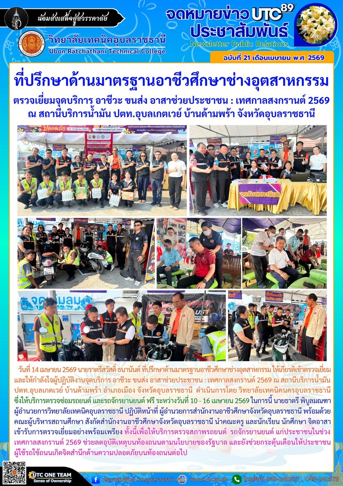 วันที่ 14 เมษายน 2569 นายราตรีสวัสดิ์ ธนานันต์ ที่ปรึกษาด้านมาตรฐานอาชีวศึกษาช่างอุตสาหกรรม ให้เกียรติเข้าตรวจเยี่ยมและให้กำลังใจผู้ปฏิบัติงานจุดบริการ อาชีวะ ขนส่ง อาสาช่วยประชาชน : เทศกาลสงกรานต์ 2569 ณ สถานีบริการน้ำมัน ปตท.อุบลเกตเวย์ บ้านด้ามพร้า อำเภอเมือง จังหวัดอุบลราชธานี ดำเนินการโดย วิทยาลัยเทคนิคนครอุบลราชธานี ซึ่งให้บริการตรวจซ่อมรถยนต์ และรถจักรยานยนต์ ฟรี ระหว่างวันที่ 10 – 16 เมษายน 2569 ในการนี้ นายธาตรี พิบูลมณฑา ผู้อำนวยการวิทยาลัยเทคนิคอุบลราชธานี ปฏิบัติหน้าที่ ผู้อำนวยการสำนักงานอาชีวศึกษาจังหวัดอุบลราชธานี พร้อมด้วยคณะผู้บริหารสถานศึกษา สังกัดสำนักงานอาชีวศึกษาจังหวัดอุบลราชธานี นำคณะครู และนักเรียน นักศึกษา จิตอาสา เข้ารับการตรวจเยี่ยมอย่างพร้อมเพรียง ทั้งนี้เพื่อให้บริการตรวจสภาพรถยนต์ รถจักรยานยนต์ แก่ประชาชนในช่วงเทศกาลสงกรานต์ 2569 ช่วยลดอุบัติเหตุบนท้องถนนตามนโยบายของรัฐบาล และยังช่วยกระตุ้นเตือนให้ประชาชนผู้ใช้รถใช้ถนนเกิดจิตสำนึกด้านความปลอดภัยบนท้องถนนต่อไป