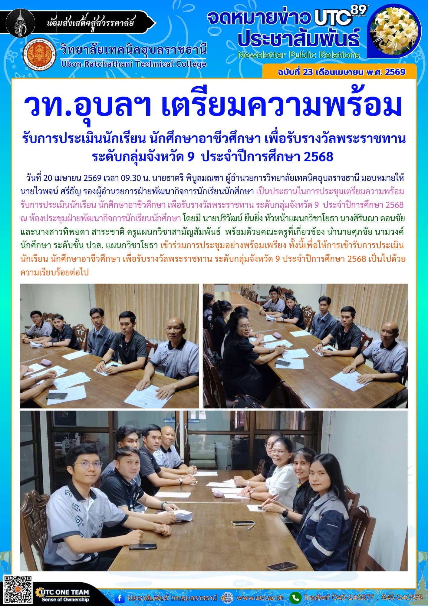 วันที่ 20 เมษายน 2569 เวลา 09.30 น. นายธาตรี พิบูลมณฑา ผู้อำนวยการวิทยาลัยเทคนิคอุบลราชธานี มอบหมายให้ นายไวพจน์ ศรีธัญ รองผู้อำนวยการฝ่ายพัฒนากิจการนักเรียนนักศึกษา เป็นประธานในการประชุมเตรียมความพร้อมรับการประเมินนักเรียน นักศึกษาอาชีวศึกษา เพื่อรับรางวัลพระราชทาน ระดับกลุ่มจังหวัด 9 ประจำปีการศึกษา 2568 ณ ห้องประชุมฝ่ายพัฒนากิจการนักเรียนนักศึกษา โดยมี นายปริวัฒน์ ยืนยิ่ง หัวหน้าแผนกวิชาโยธา นางศิรินณา ดอนชัย และนางสาวทิพยดา สาระชาติ ครูแผนกวิชาสามัญสัมพันธ์ พร้อมด้วยคณะครูที่เกี่ยวข้อง นำนายศุภชัย นามวงค์ นักศึกษา ระดับชั้น ปวส. แผนกวิชาโยธา เข้าร่วมการประชุมอย่างพร้อมเพรียง ทั้งนี้เพื่อให้การเข้ารับการประเมิน นักเรียน นักศึกษาอาชีวศึกษา เพื่อรับรางวัลพระราชทาน ระดับกลุ่มจังหวัด 9 ประจำปีการศึกษา 2568 เป็นไปด้วยความเรียบร้อยต่อไป