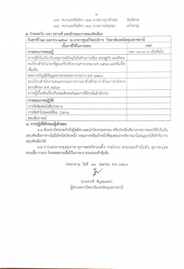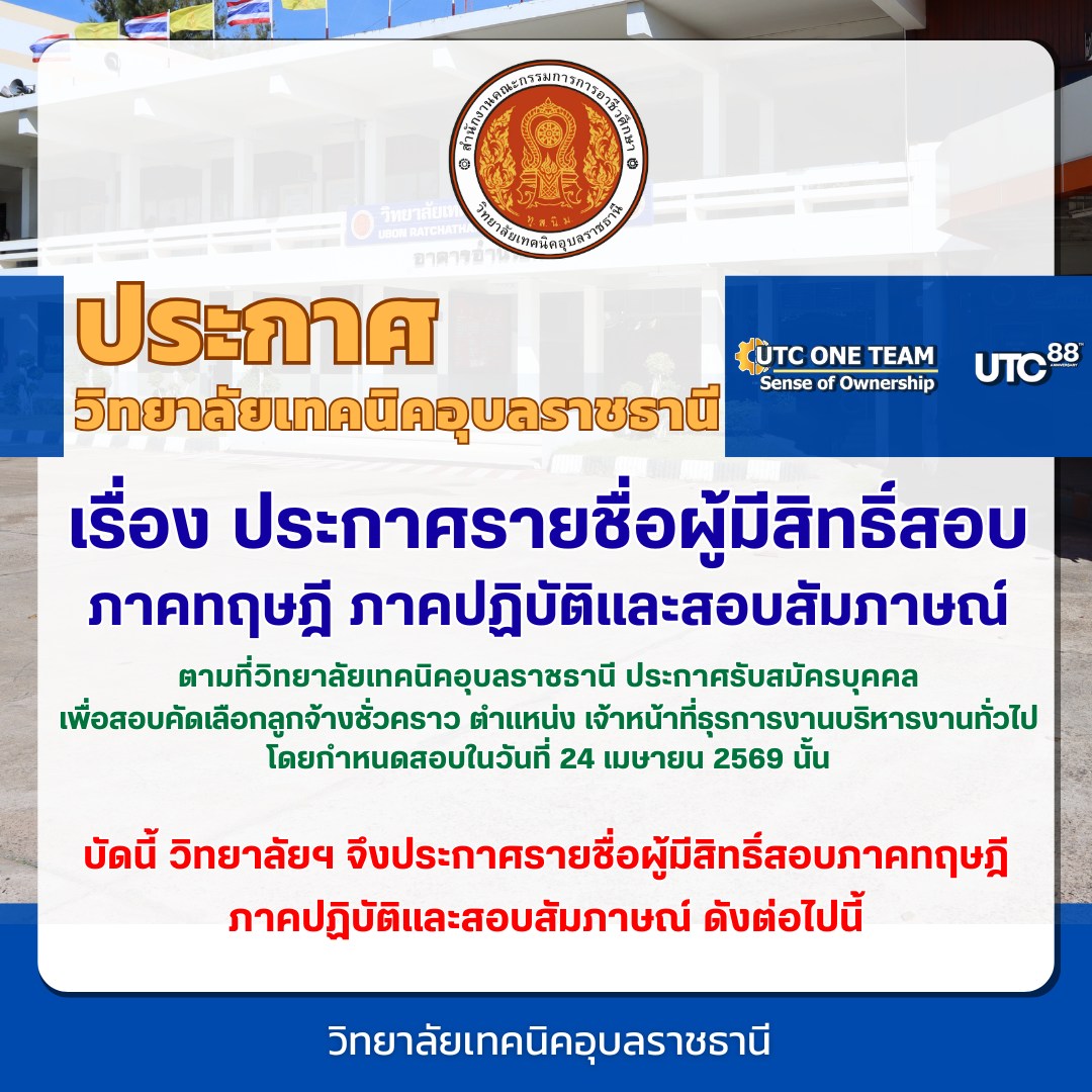 ตามที่วิทยาลัยเทคนิคอุบลราชธานี ประกาศรับสมัครบุคคลเพื่อสอบคัดเลือกลูกจ้างชั่วคราว ตำแหน่ง เจ้าหน้าที่ธุรการงานบริหารงานทั่วไป โดยกำหนดสอบในวันที่ 24 เมษายน 2569 นั้น