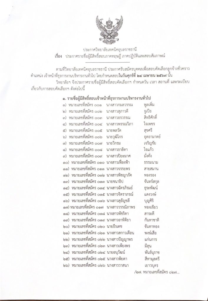 ประกาศวิทยาลัยเทคนิคอุบลราชธานีเรื่อง ประกาศรายชื่อผู้มีสิทธิ์สอบภาคทฤษฎี ภาคปฏิบัติและสอบสัมภาษณ์