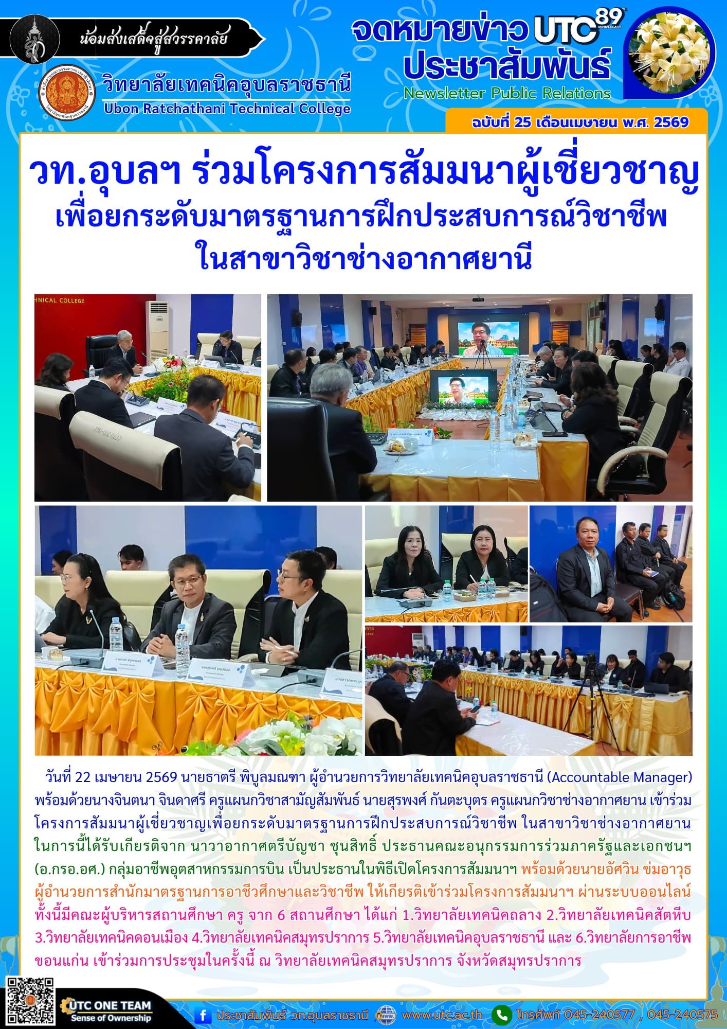 วันที่ 22 เมษายน 2569 นายธาตรี พิบูลมณฑา ผู้อำนวยการวิทยาลัยเทคนิคอุบลราชธานี (Accountable Manager) พร้อมด้วยนางจินตนา จินดาศรี ครูแผนกวิชาสามัญสัมพันธ์ นายสุรพงศ์ กันตะบุตร ครูแผนกวิชาช่างอากาศยาน เข้าร่วมโครงการสัมมนาผู้เชี่ยวชาญเพื่อยกระดับมาตรฐานการฝึกประสบการณ์วิชาชีพ ในสาขาวิชาช่างอากาศยาน ในการนี้ได้รับเกียรติจาก นาวาอากาศตรีบัญชา ชุนสิทธิ์ ประธานคณะอนุกรรมการร่วมภาครัฐและเอกชนฯ (อ.กรอ.อศ.) กลุ่มอาชีพอุตสาหกรรมการบิน เป็นประธานในพิธีเปิดโครงการสัมมนาฯ พร้อมด้วยนายอัศวิน ข่มอาวุธ ผู้อำนวยการสำนักมาตรฐานการอาชีวศึกษาและวิชาชีพ ให้เกียรติเข้าร่วมโครงการสัมมนาฯ ผ่านระบบออนไลน์ ทั้งนี้มีคณะผู้บริหารสถานศึกษา ครู จาก 6 สถานศึกษา ได้แก่ 1.วิทยาลัยเทคนิคถลาง 2.วิทยาลัยเทคนิคสัตหีบ 3.วิทยาลัยเทคนิคดอนเมือง 4.วิทยาลัยเทคนิคสมุทรปราการ 5.วิทยาลัยเทคนิคอุบลราชธานี และ 6.วิทยาลัยการอาชีพขอนแก่น เข้าร่วมการประชุมในครั้งนี้ ณ วิทยาลัยเทคนิคสมุทรปราการ จังหวัดสมุทรปราการ