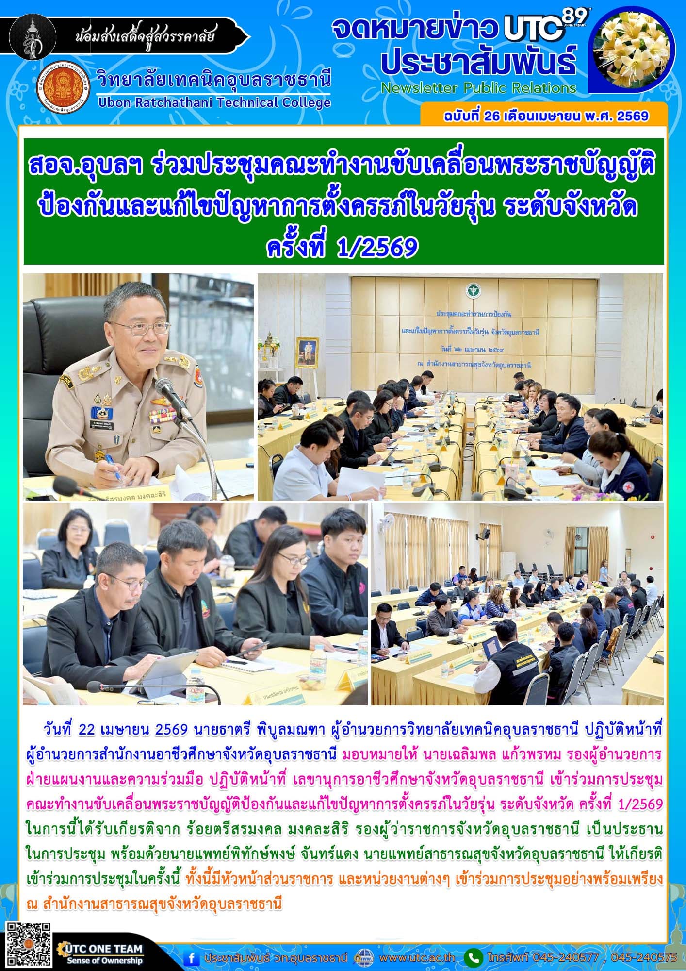 วันที่ 22 เมษายน 2569 นายธาตรี พิบูลมณฑา ผู้อำนวยการวิทยาลัยเทคนิคอุบลราชธานี ปฏิบัติหน้าที่ ผู้อำนวยการสำนักงานอาชีวศึกษาจังหวัดอุบลราชธานี มอบหมายให้ นายเฉลิมพล แก้วพรหม รองผู้อำนวยการฝ่ายแผนงานและความร่วมมือ ปฏิบัติหน้าที่ เลขานุการอาชีวศึกษาจังหวัดอุบลราชธานี เข้าร่วมการประชุมคณะทำงานขับเคลื่อนพระราชบัญญัติป้องกันและแก้ไขปัญหาการตั้งครรภ์ในวัยรุ่น ระดับจังหวัด ครั้งที่ 1/2569 ในการนี้ได้รับเกียรติจาก ร้อยตรีสรมงคล มงคละสิริ รองผู้ว่าราชการจังหวัดอุบลราชธานี เป็นประธานในการประชุม พร้อมด้วยนายแพทย์พิทักษ์พงษ์ จันทร์แดง นายแพทย์สาธารณสุขจังหวัดอุบลราชธานี ให้เกียรติเข้าร่วมการประชุมในครั้งนี้ ทั้งนี้มีหัวหน้าส่วนราชการ และหน่วยงานต่างๆ เข้าร่วมการประชุมอย่างพร้อมเพรียง ณ สำนักงานสาธารณสุขจังหวัดอุบลราชธานี
