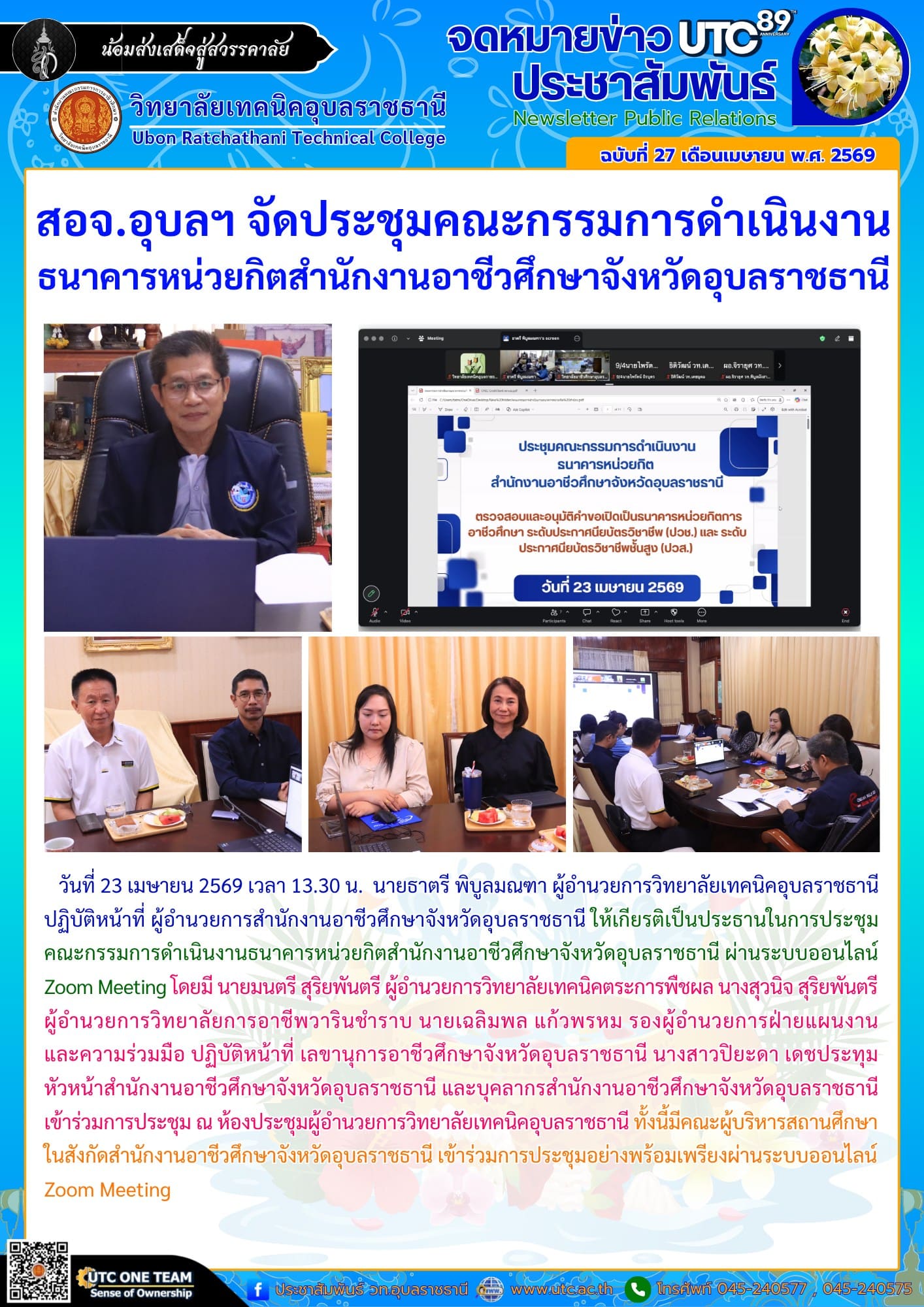 วันที่ 23 เมษายน 2569 เวลา 13.30 น. นายธาตรี พิบูลมณฑา ผู้อำนวยการวิทยาลัยเทคนิคอุบลราชธานี ปฏิบัติหน้าที่ ผู้อำนวยการสำนักงานอาชีวศึกษาจังหวัดอุบลราชธานี ให้เกียรติเป็นประธานในการประชุมคณะกรรมการดำเนินงานธนาคารหน่วยกิตสำนักงานอาชีวศึกษาจังหวัดอุบลราชธานี ผ่านระบบออนไลน์ Zoom Meeting โดยมี นายมนตรี สุริยพันตรี ผู้อำนวยการวิทยาลัยเทคนิคตระการพืชผล นางสุวนิจ สุริยพันตรี ผู้อำนวยการวิทยาลัยการอาชีพวารินชำราบ นายเฉลิมพล แก้วพรหม รองผู้อำนวยการฝ่ายแผนงานและความร่วมมือ ปฏิบัติหน้าที่ เลขานุการอาชีวศึกษาจังหวัดอุบลราชธานี นางสาวปิยะดา เดชประทุม หัวหน้าสำนักงานอาชีวศึกษาจังหวัดอุบลราชธานี และบุคลากรสำนักงานอาชีวศึกษาจังหวัดอุบลราชธานี เข้าร่วมการประชุม ณ ห้องประชุมผู้อำนวยการวิทยาลัยเทคนิคอุบลราชธานี ทั้งนี้มีคณะผู้บริหารสถานศึกษา ในสังกัดสำนักงานอาชีวศึกษาจังหวัดอุบลราชธานี เข้าร่วมการประชุมอย่างพร้อมเพรียงผ่านระบบออนไลน์ Zoom Meeting