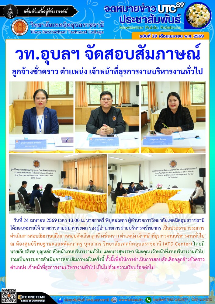 วันที่ 24 เมษายน 2569 เวลา 13.00 น. นายธาตรี พิบูลมณฑา ผู้อำนวยการวิทยาลัยเทคนิคอุบลราชธานี ได้มอบหมายให้ นางสาวสายฝน สาระผล รองผู้อำนวยการฝ่ายบริหารทรัพยากร เป็นประธานกรรมการดำเนินการสอบสัมภาษณ์ในการสอบคัดเลือกลูกจ้างชั่วคราว ตำแหน่ง เจ้าหน้าที่ธุรการงานบริหารงานทั่วไป ณ ห้องศูนย์วิทยฐานะและพัฒนาครู บุคลากร วิทยาลัยเทคนิคอุบลราชธานี (ATD Center) โดยมี นายเกียรติพล บุญหล่อ หัวหน้างานบริหารงานทั่วไป และนางสุพรรษา หิมะคุณ เจ้าหน้าที่งานบริหารงานทั่วไป ร่วมเป็นกรรมการดำเนินการสอบสัมภาษณ์ในครั้งนี้ ทั้งนี้เพื่อให้การดำเนินการสอบคัดเลือกลูกจ้างชั่วคราว ตำแหน่ง เจ้าหน้าที่ธุรการงานบริหารงานทั่วไป เป็นไปด้วยความเรียบร้อยต่อไป