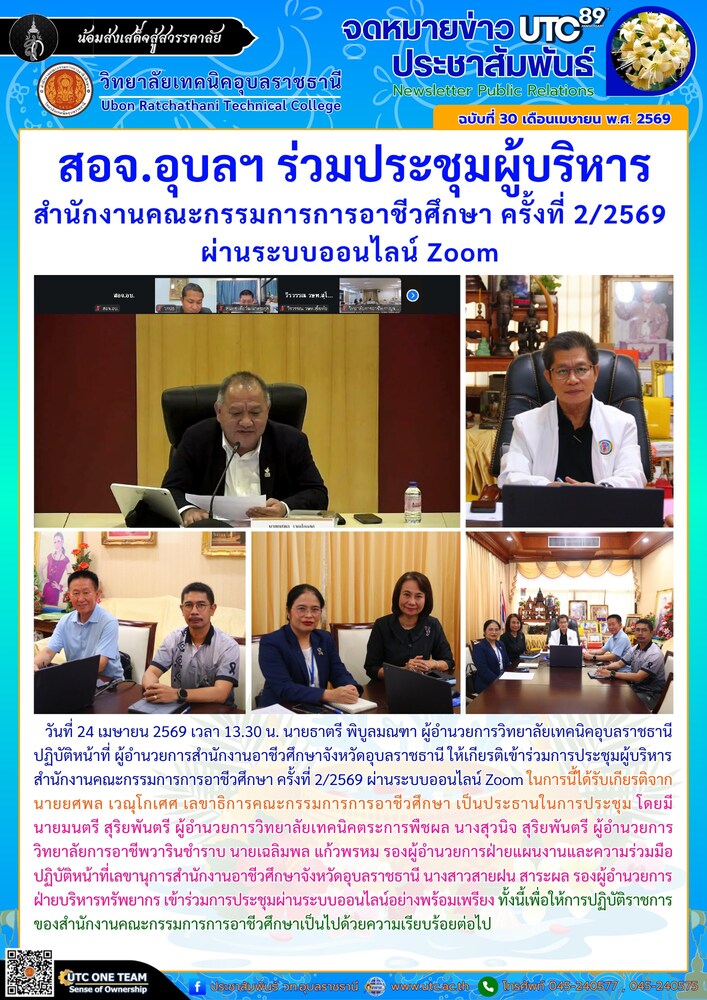 วันที่ 24 เมษายน 2569 เวลา 13.30 น. นายธาตรี พิบูลมณฑา ผู้อำนวยการวิทยาลัยเทคนิคอุบลราชธานี ปฏิบัติหน้าที่ ผู้อำนวยการสำนักงานอาชีวศึกษาจังหวัดอุบลราชธานี ให้เกียรติเข้าร่วมการประชุมผู้บริหารสำนักงานคณะกรรมการการอาชีวศึกษา ครั้งที่ 2/2569 ผ่านระบบออนไลน์ Zoom ในการนี้ได้รับเกียรติจาก นายยศพล เวณุโกเศศ เลขาธิการคณะกรรมการการอาชีวศึกษา เป็นประธานในการประชุม โดยมี นายมนตรี สุริยพันตรี ผู้อำนวยการวิทยาลัยเทคนิคตระการพืชผล นางสุวนิจ สุริยพันตรี ผู้อำนวยการวิทยาลัยการอาชีพวารินชำราบ นายเฉลิมพล แก้วพรหม รองผู้อำนวยการฝ่ายแผนงานและความร่วมมือ ปฏิบัติหน้าที่เลขานุการสำนักงานอาชีวศึกษาจังหวัดอุบลราชธานี นางสาวสายฝน สาระผล รองผู้อำนวยการฝ่ายบริหารทรัพยากร เข้าร่วมการประชุมผ่านระบบออนไลน์อย่างพร้อมเพรียง ทั้งนี้เพื่อให้การปฏิบัติราชการของสำนักงานคณะกรรมการการอาชีวศึกษาเป็นไปด้วยความเรียบร้อยต่อไป