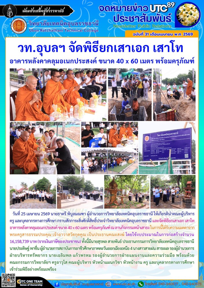 วันที่ 25 เมษายน 2569 นายธาตรี พิบูลมณฑา ผู้อำนวยการวิทยาลัยเทคนิคอุบลราชธานี ให้เกียรตินำคณะผู้บริหาร ครู และบุคลากรทางการศึกษา กราบสักการะสิ่งศักดิ์สิทธิ์ประจำวิทยาลัยเทคนิคอุบลราชธานี และจัดพิธียกเสาเอก เสาโท อาคารหลังคาคลุมอเนกประสงค์ ขนาด 40 x 60 เมตร พร้อมครุภัณฑ์ ณ ลานกิจกรรมหน้าเสาธง ในการนี้ได้รับความเมตตาจาก พระครูสารธรรมประคุณ เจ้าอาวาสวัดกุดคูณ เป็นประธานคณะสงฆ์ โดยใช้งบประมาณในการก่อสร้างจำนวน 16,158,739 บาท (จากเงินภาษีของประชาชน) ทั้งนี้มีนายสุรพล สายพันธ์ ประธานกรรมการวิทยาลัยเทคนิคอุบลราชธานี นายประดิษฐ์ พาชื่น ผู้อำนวยการสถาบันการอาชีวศึกษาภาคตะวันออกเฉียงเหนือ 4 นางสาวสายฝน สาระผล รองผู้อำนวยการฝ่ายบริหารทรัพยากร นายเฉลิมพล แก้วพรหม รองผู้อำนวยการฝ่ายแผนงานและความร่วมมือ พร้อมด้วยคณะกรรมการวิทยาลัยฯ ครูอาวุโส คณะผู้บริหาร หัวหน้าแผนกวิชา หัวหน้างาน ครู และบุคลากรทางการศึกษา เข้าร่วมพิธีอย่างพร้อมเพรียง