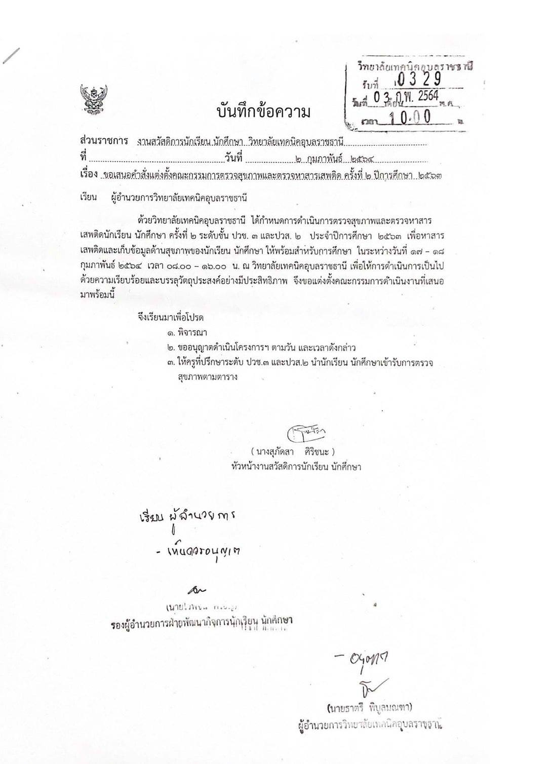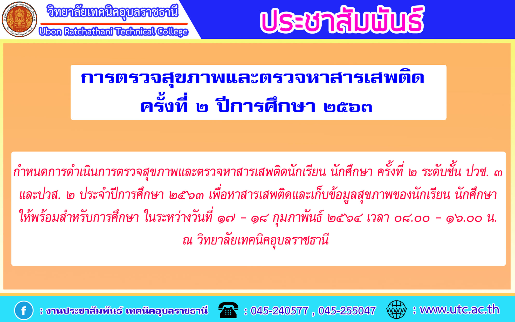 การตรวจสุขภาพและตรวจหาสารเสพติด ครั้งที่ ๒ ปีการศึกษา ๒๕๖๓ กำหนดการดำเนินการตรวจสุขภาพและตรวจหาสารเสพติดนักเรียน นักศึกษา ครั้งที่ ๒ ระดับชั้น ปวช. ๓และปวส. ๒ ประจำปีการศึกษา ๒๕๖๓ เพื่อหาสารเสพติดและเก็บข้อมูลสุขภาพของนักเรียน นักศึกษาให้พร้อมสำหรับการศึกษา ในระหว่างวันที่ ๑๗ – ๑๘ กุมภาพันธ์ ๒๕๖๔ เวลา ๐๘.๐๐ – ๑๖.๐๐ น.ณ วิทยาลัยเทคนิคอุบลราชธานี