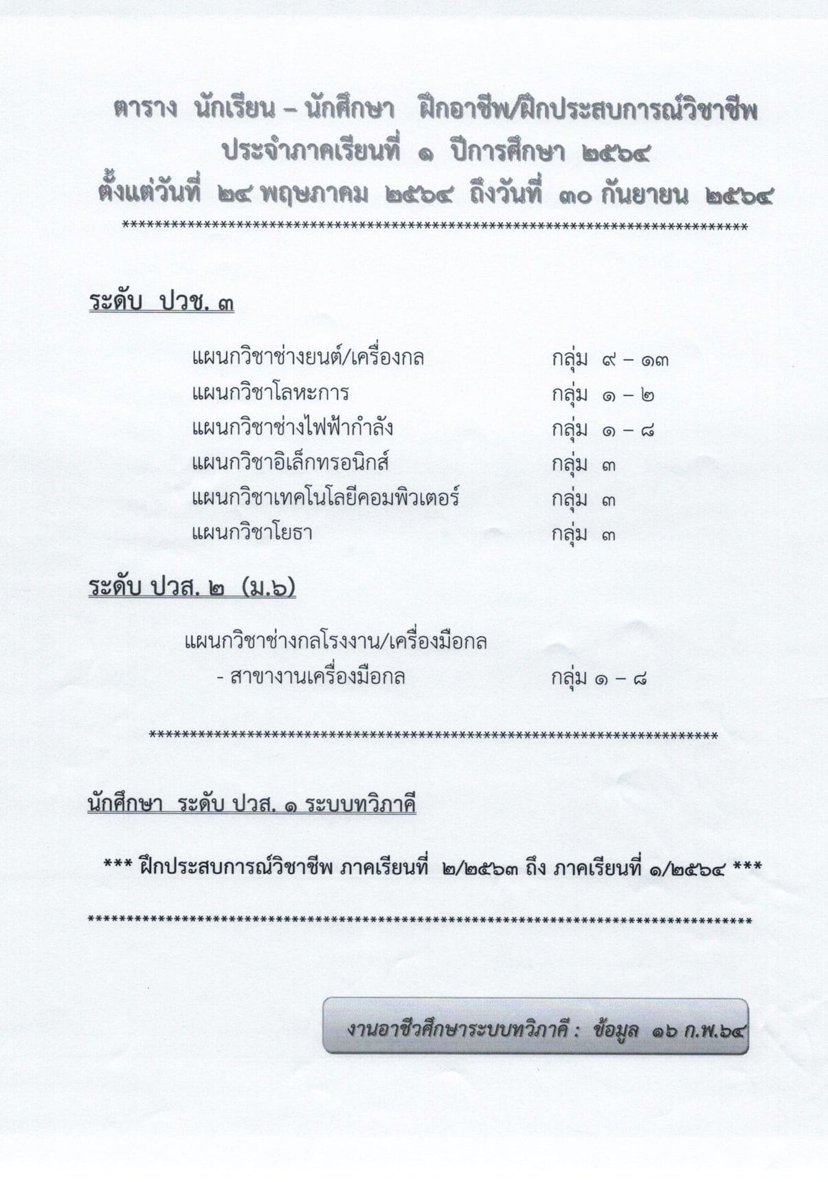 งานอาชีวศึกษาระบบทวิภาคี แจ้งกำหนดการฝึกอาชีพ/ฝึกประสบการณ์วิชาชีพของนักเรียน นักศึกษา