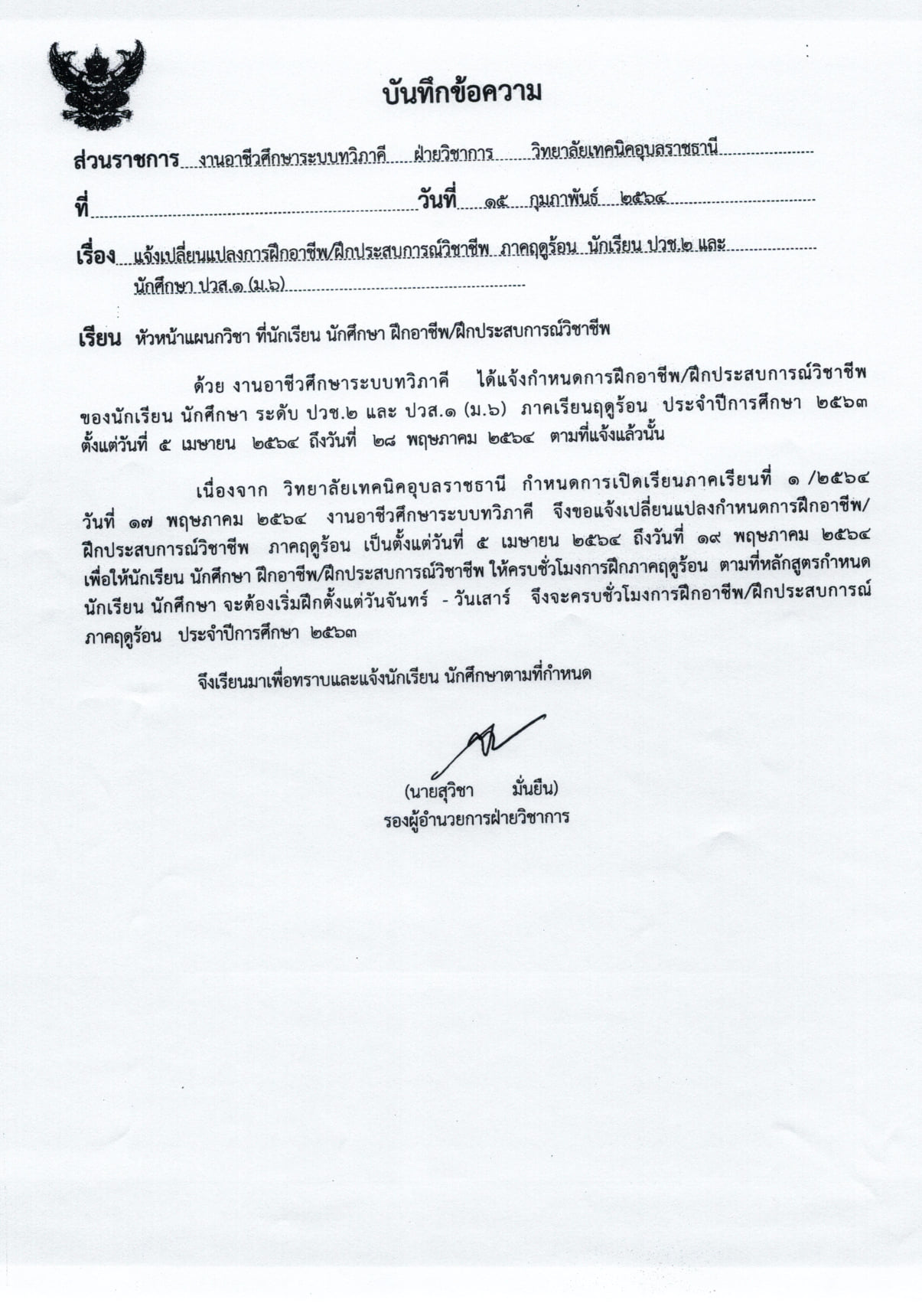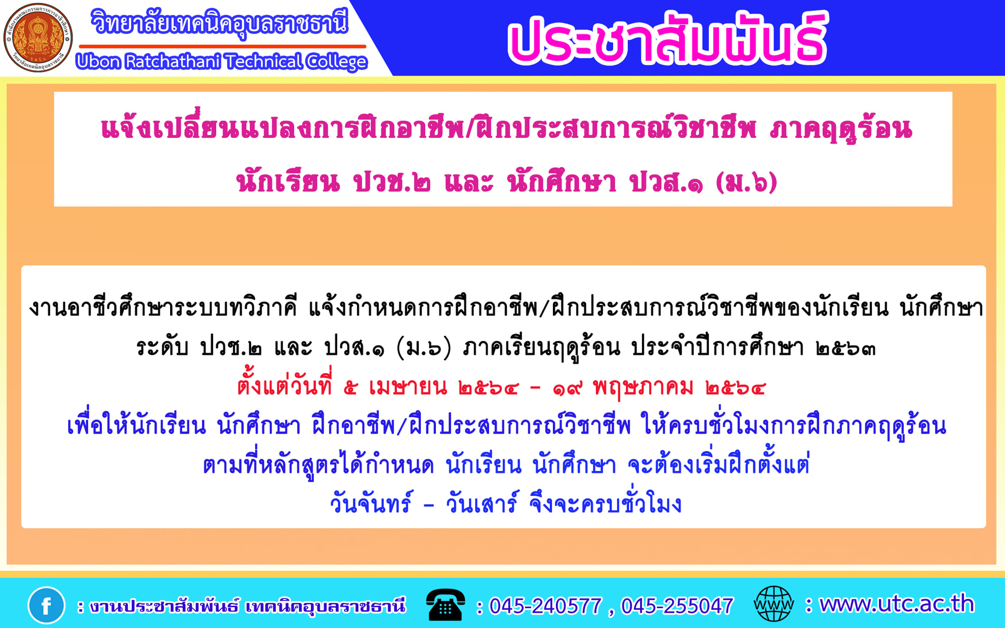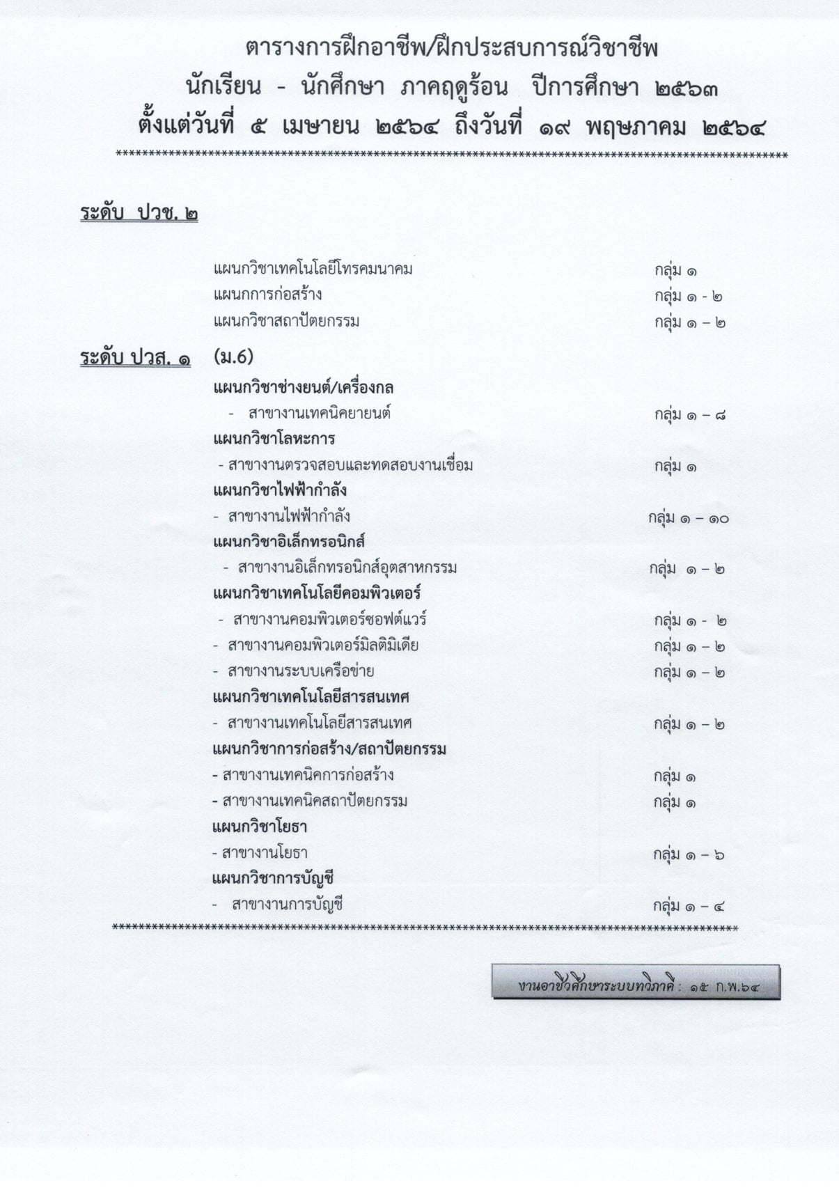 งานอาชีวศึกษาระบบทวิภาคี แจ้งกำหนดการฝึกอาชีพ/ฝึกประสบการณ์วิชาชีพของนักเรียน นักศึกษา ระดับ ปวช.๒ และ ปวส.๑ (ม.๖) ภาคเรียนฤดูร้อน ประจำปีการศึกษา ๒๕๖๓ ตั้งแต่วันที่ ๕ เมษายน ๒๕๖๔ – ๑๙ พฤษภาคม ๒๕๖๔ เพื่อให้นักเรียน นักศึกษา ฝึกอาชีพ/ฝึกประสบการณ์วิชาชีพ ให้ครบชั่วโมงการฝึกภาคฤดูร้อนตามที่หลักสูตรได้กำหนด นักเรียน นักศึกษา จะต้องเริ่มฝึกตั้งแต่วันจันทร์ – วันเสาร์ จึงจะครบชั่วโมง