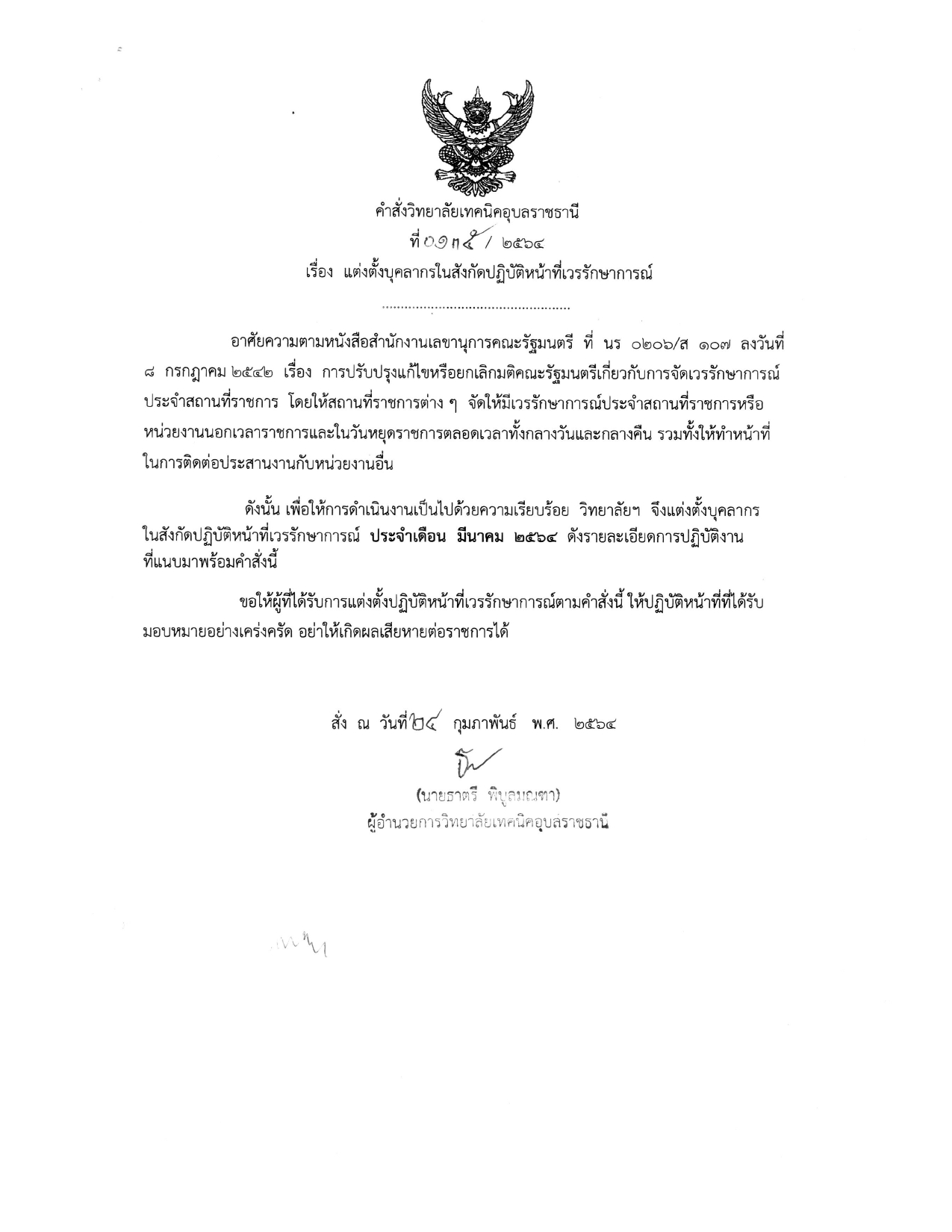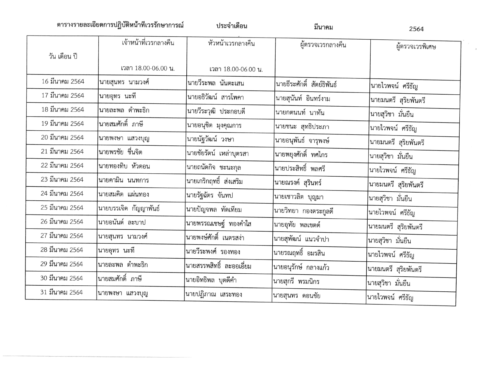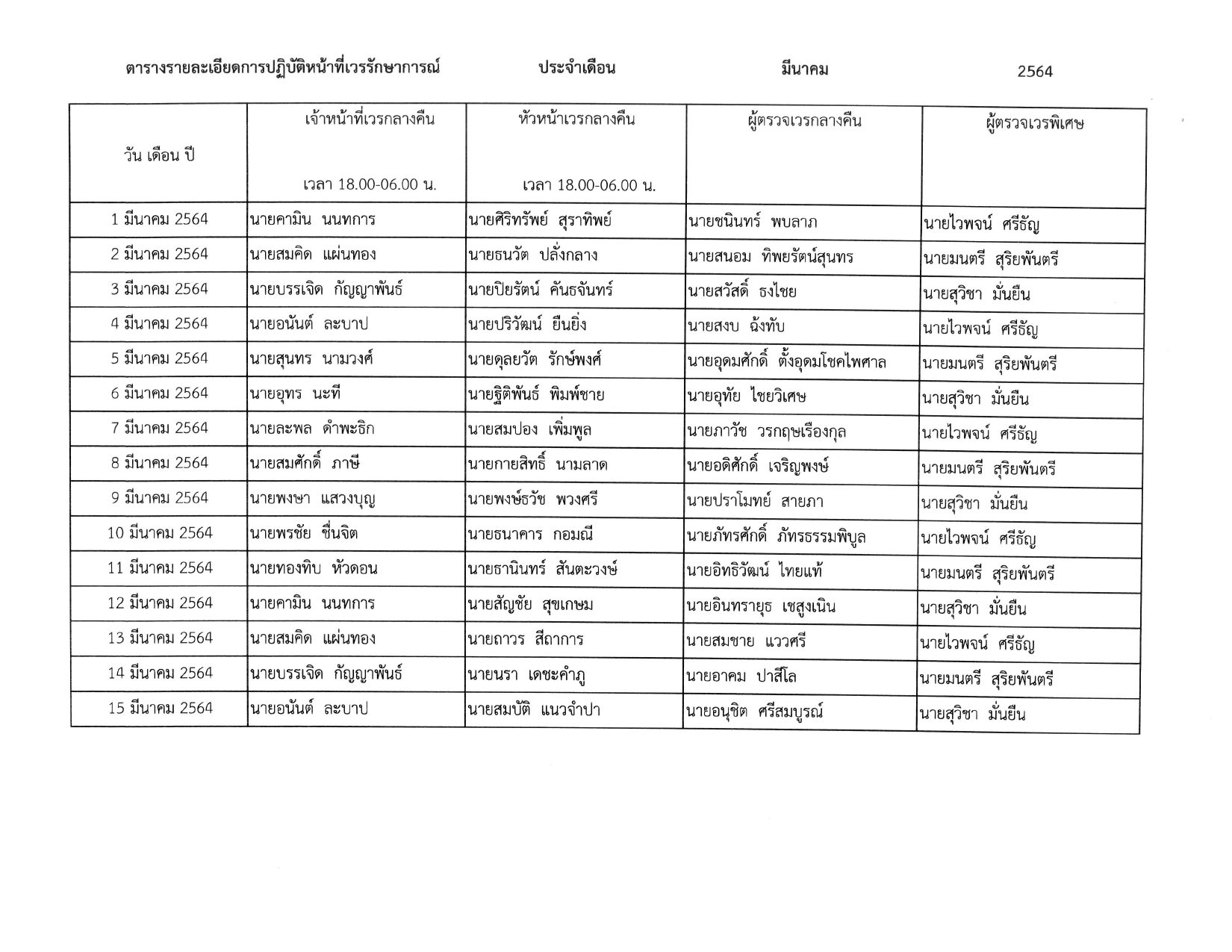 แต่งตั้งบุคคลากรในสังกัดปฏิบัติหน้าที่เวรรักษาการณ์ ภาคกลางวัน ประจำเดือนพฤศจิกายน 2564