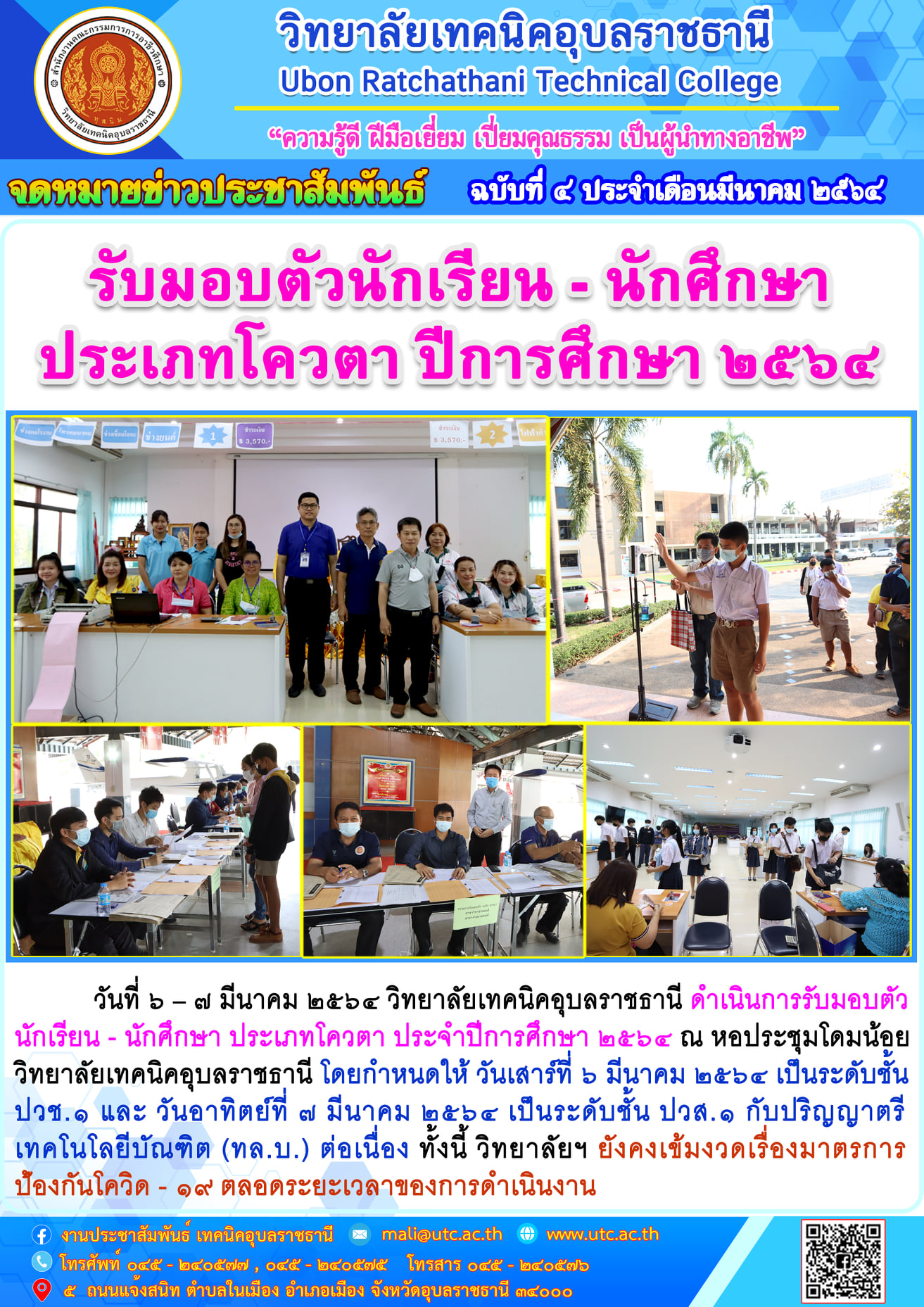วันที่ ๖ – ๗ มีนาคม ๒๕๖๔ วิทยาลัยเทคนิคอุบลราชธานี ดำเนินการรับมอบตัวนักเรียน – นักศึกษา ประเภทโควตา ปีการศึกษา ๒๕๖๔ ณ หอประชุมโดมน้อย วิทยาลัยเทคนิคอุบลราชธานี โดยทั้งนี้วิทยาลัยเทคนิคอุบลราชธานี ยังคงเข้มงวดเรื่องมาตรการป้องกันโควิด – ๑๙ ตลอดระยะเวลาของการดำเนินงาน