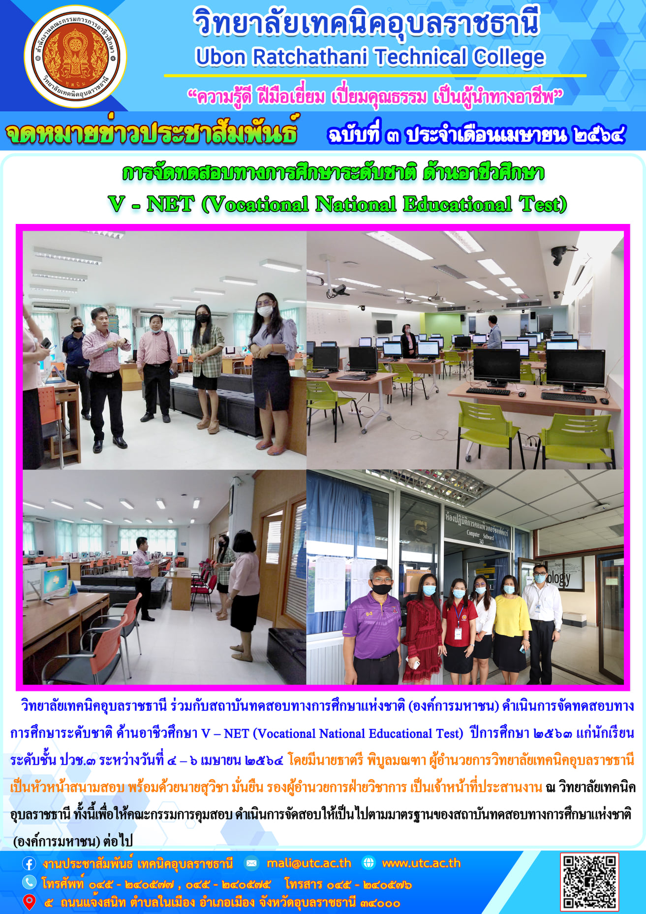 (องค์การมหาชน) ดำเนินการจัดทดสอบทางการศึกษาระดับชาติ ด้านอาชีวศึกษา V – NET (Vocational National Educational Test) ปีการศึกษา ๒๕๖๓ แก่นักเรียนระดับชั้น ปวช.๓ ระหว่างวันที่ ๔ – ๖ เมษายน ๒๕๖๔ โดยมีนายธาตรี พิบูลมณฑา ผู้อำนวยการวิทยาลัยเทคนิคอุบลราชธานี เป็นหัวหน้าสนามสอบ พร้อมด้วยนายสุวิชา มั่นยืน รองผู้อำนวยการฝ่ายวิชาการ เป็นเจ้าหน้าที่ประสานงาน ณ วิทยาลัยเทคนิคอุบลราชธานี ทั้งนี้เพื่อให้คณะกรรมการคุมสอบ ดำเนินการจัดสอบให้เป็นไปตามมาตรฐานของสถาบันทดสอบทางการศึกษาแห่งชาติ (องค์การมหาชน) ต่อไป