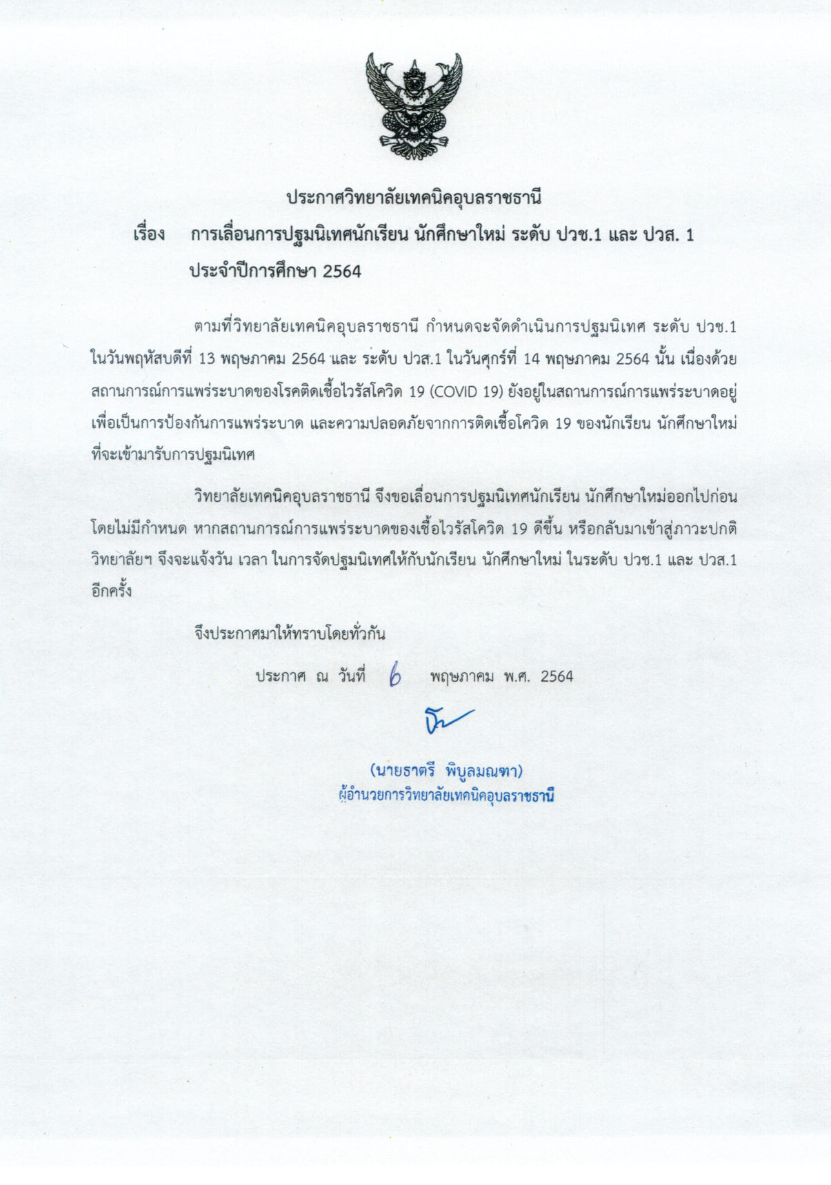 จากเดิม ระดับ ปวช.๑ วันพฤหัสบดีที่ ๑๓ พฤษภาคม๒๕๖๔ ระดับปวส.๒ วันศุกร์ที่ ๑๔ พฤษภาคม ๒๕๖๔ โดยเลื่อนการปฐมนิเทศนักเียน นักศึกษาใหม่ออกไปก่อนจนกว่าสถานการณ์การแพร่ระบาดของโรคติดเชื้อไวรัสโคโรนา ๒๐๑๙ (COVID19) จะคลี่คลาย