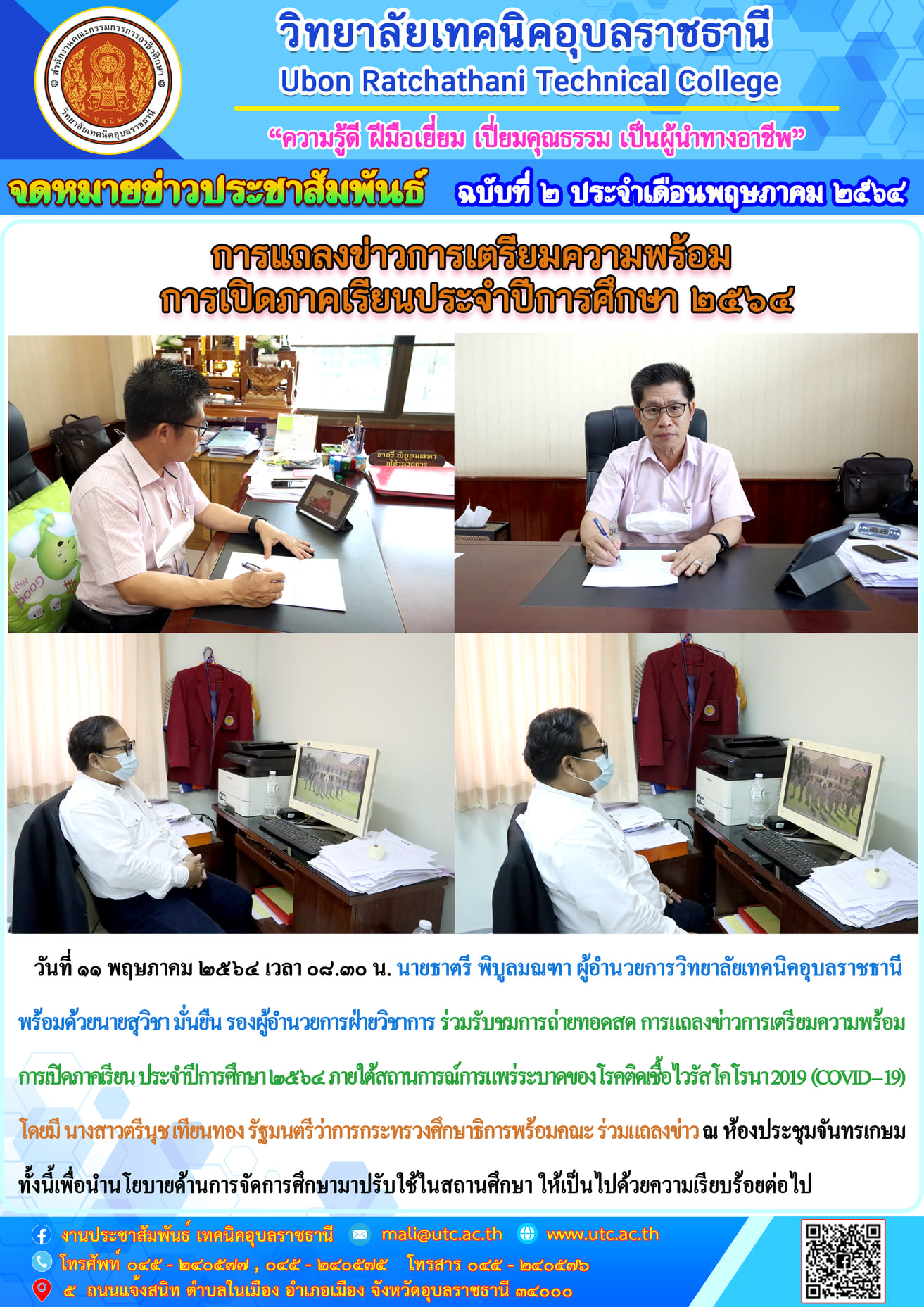 วันที่ ๑๑ พฤษภาคม ๒๕๖๔ เวลา ๐๘.๓๐ น. นายธาตรี พิบูลมณฑา ผู้อำนวยการวิทยาลัยเทคนิคอุบลราชธานีพร้อมด้วยนายสุวิชา มั่นยืน รองผู้อำนวยการฝ่ายวิชาการ ร่วมรับชมการถ่ายทอดสด การแถลงข่าวการเตรียมความพร้อมการเปิดภาคเรียน ประจำปีการศึกษา ๒๕๖๔ ภายใต้สถานการณ์การแพร่ระบาดของโรคติดเชื้อไวรัสโคโรนา 2019 (COVID – 19)โดยมี นางสาวตรีนุช เทียนทอง รัฐมนตรีว่าการกระทรวงศึกษาธิการพร้อมคณะ ร่วมแถลงข่าว ณ ห้องประชุมจันทรเกษมทั้งนี้เพื่อนำนโยบายด้านการจัดการศึกษามาปรับใช้ในสถานศึกษา ให้เป็นไปด้วยความเรียบร้อยต่อไป