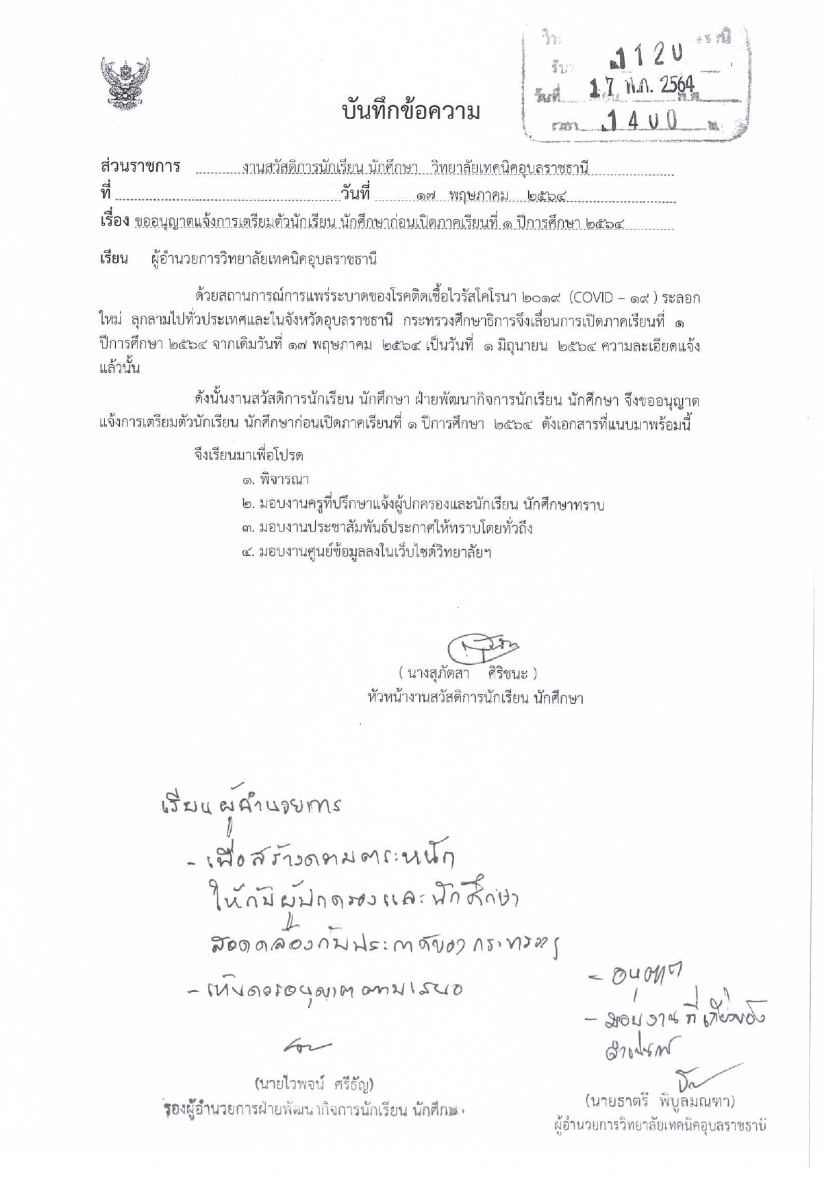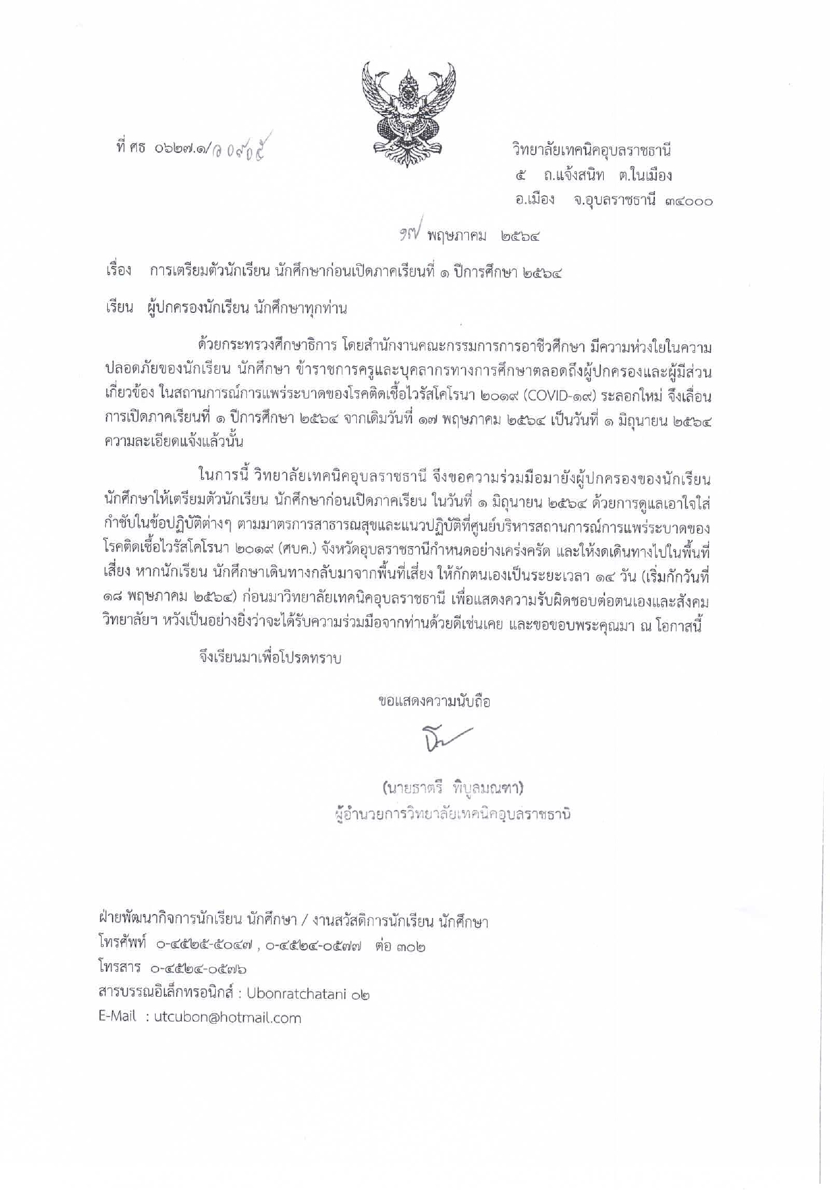 ด้วยสถานการณ์การแพร่ระบาดโควิดของโรคติดเขื้อไวรัสโคโรนา ๒๐๑๙ (COVID- ๑๙) ระลอกใหม่ ลุกลามไปทั่วประเทศและในจังหวัดอุบลราชธานี กระทรวงศึกษาธิการจึงเลื่อนการเปิดภาคเรียนที่ ๑ ปีการศึกษา ๒๕๖๔ จากเดิมวันที่ ๑๗ พฤษภาคม ๒๕๖๔ เป็นวันที่ ๑ มิถุนายน ๒๕๖๔