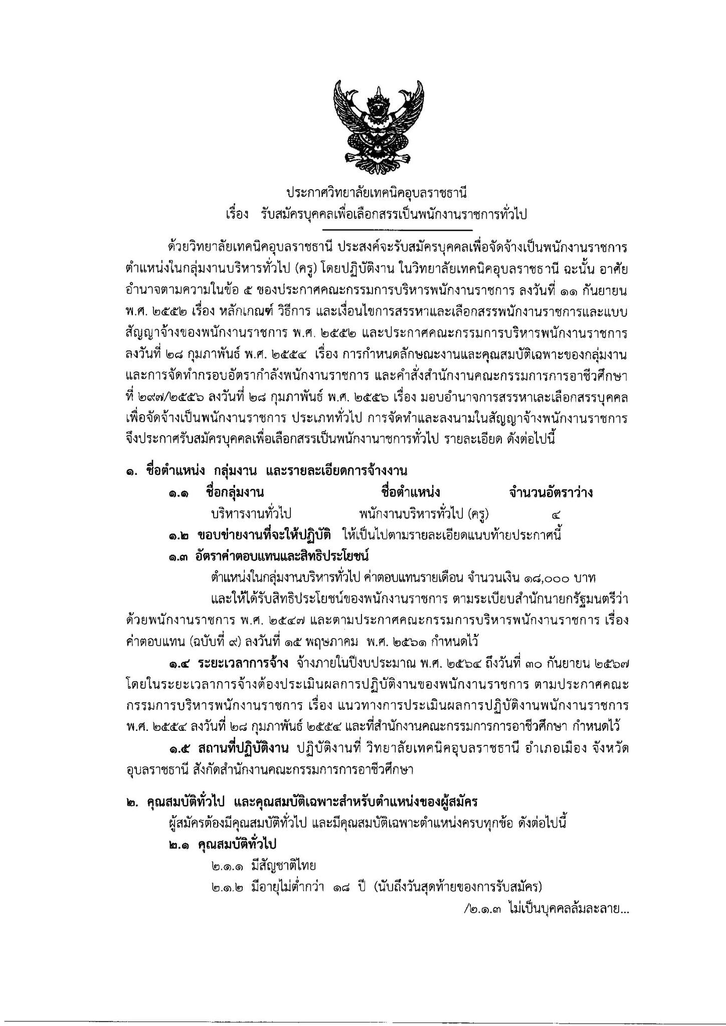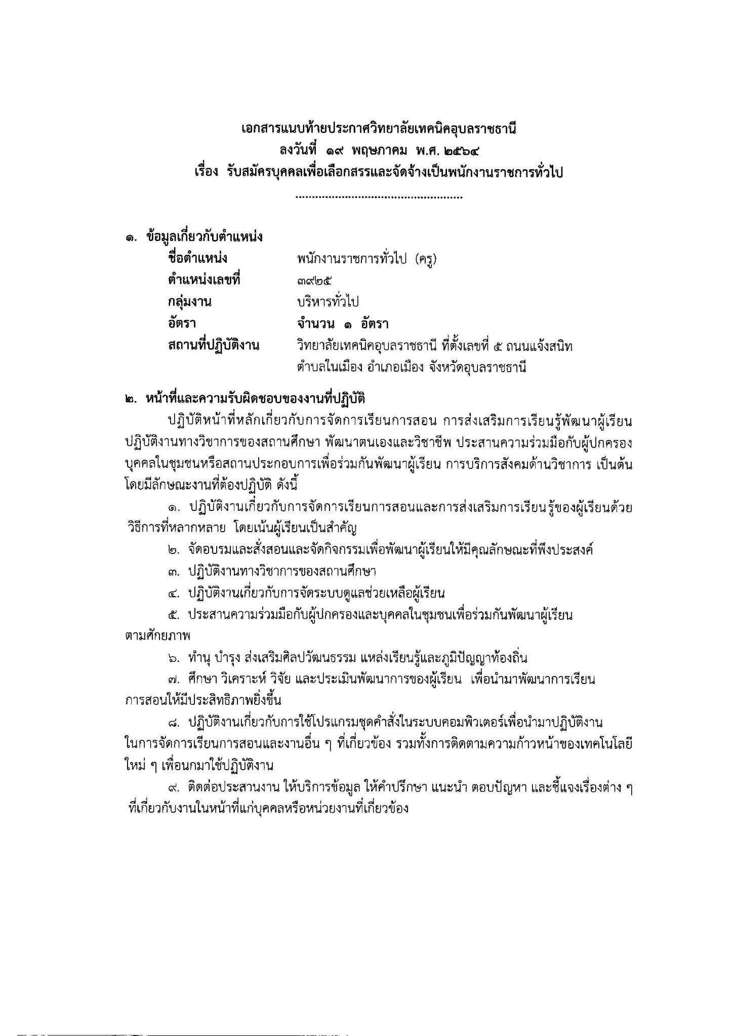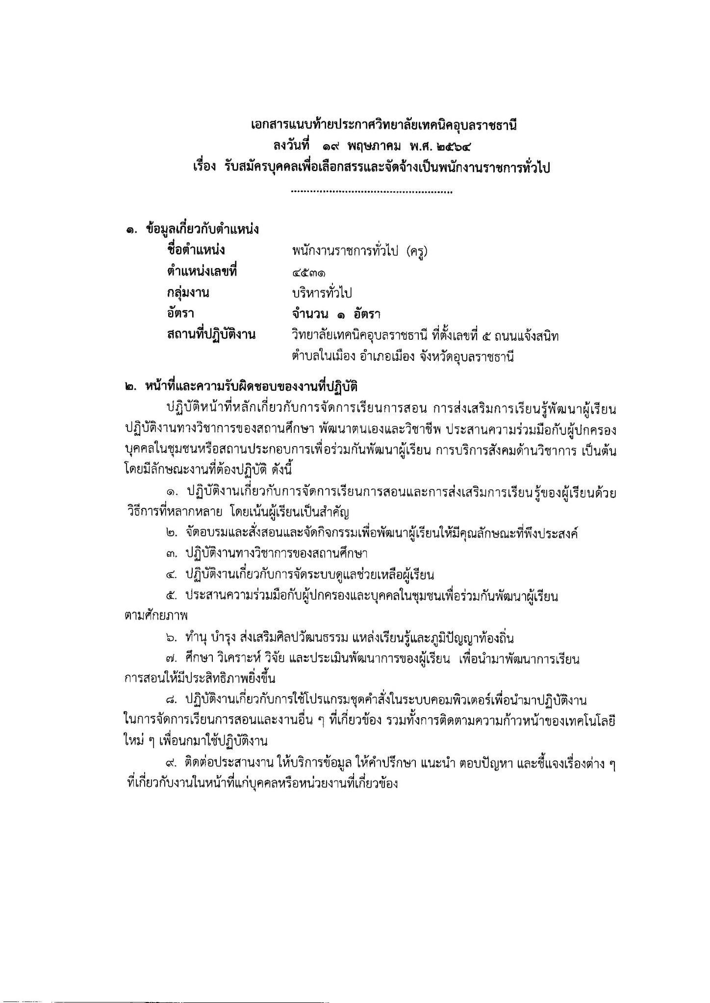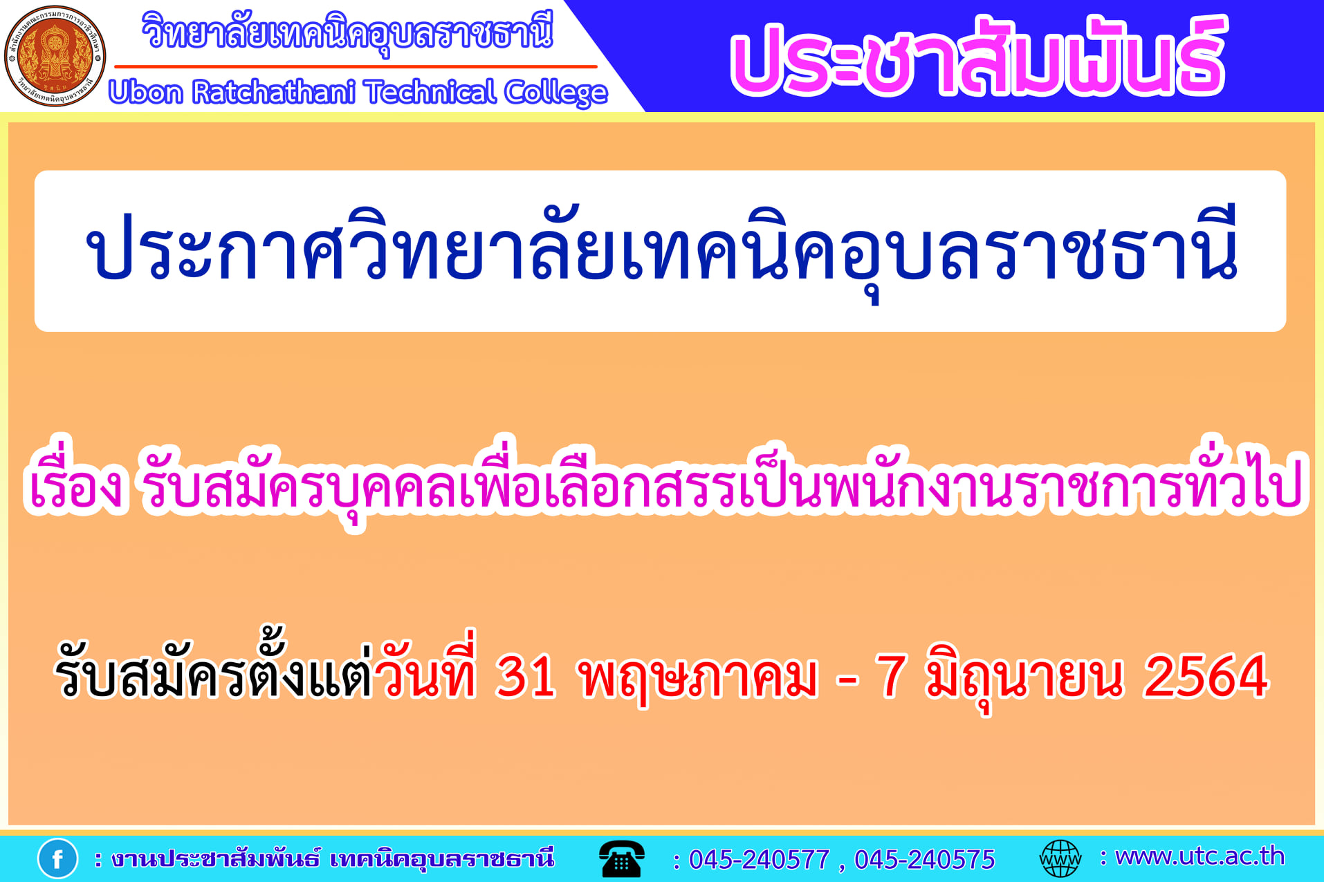 ประกาศวิทยาลัยเทคนิคอุบลราชธานี เรื่อง รับสมัครบุคคลเพื่อเลือกสรรเป็นพนักงานราชการทั่วไป รายละเอียดการรับสมัคร ตามที่แนบมานี้