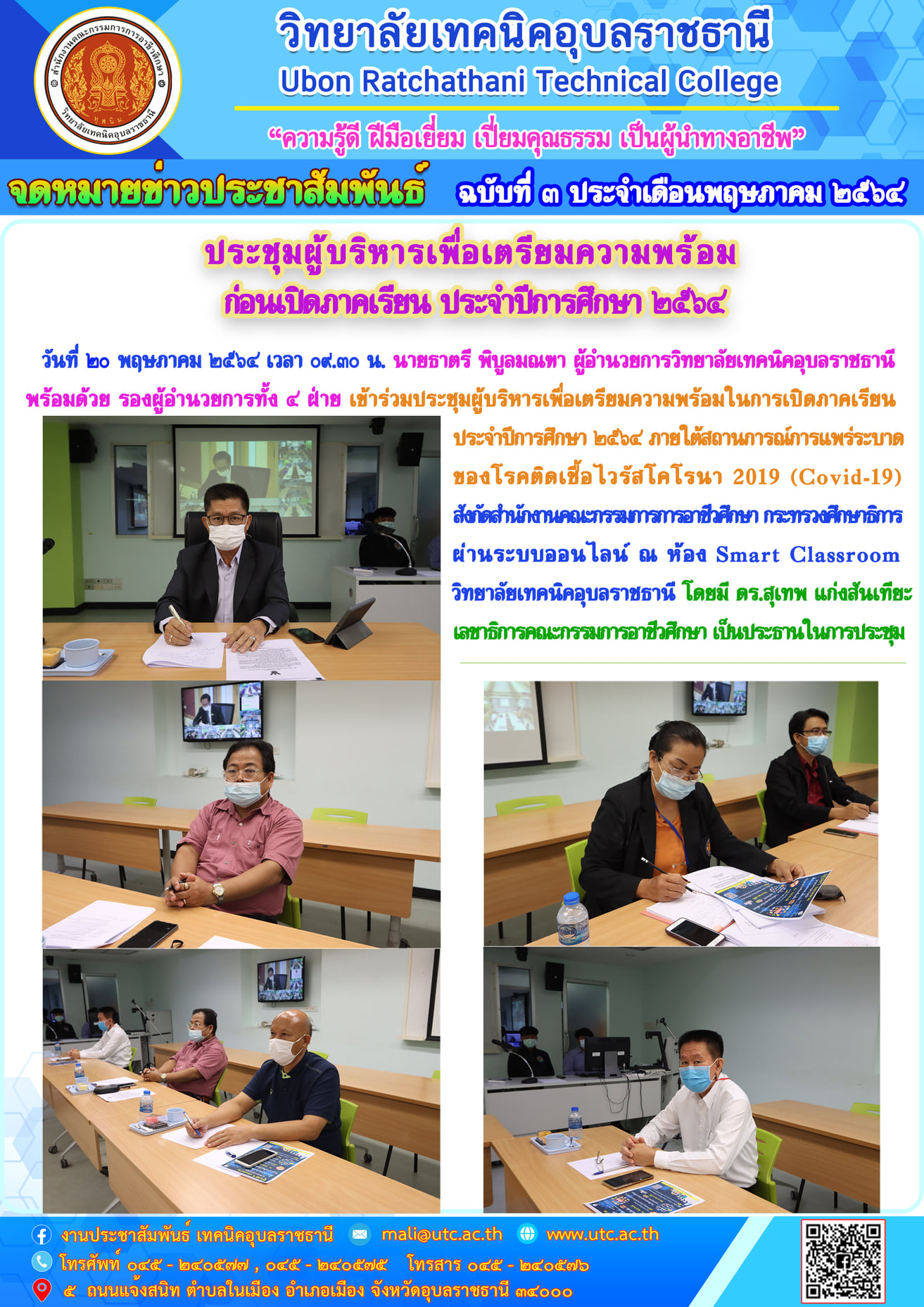 (ข่าว ปชส.วท.อบ.วันนี้ ) วันที่ ๒๐ พฤษภาคม ๒๕๖๔ เวลา ๐๙.๓๐ น. นายธาตรี พิบูลมณฑา ผู้อำนวยการวิทยาลัยเทคนิคอุบลราชธานี พร้อมด้วย รองผู้อำนวยการทั้ง ๔ ฝ่าย เข้าร่วมประชุมผู้บริหารเพื่อเตรียมความพร้อมในการเปิดภาคเรียน ประจำปีการศึกษา ๒๕๖๔ ภายใต้สถานการณ์การแพร่ระบาดของโรคติดเชื้อไวรัสโคโรนา 2019 (Covid-19) สังกัดสำนักงานคณะกรรมการการอาชีวศึกษา กระทรวงศึกษาธิการ ผ่านระบบออนไลน์ ณ ห้อง Smart Classroom วิทยาลัยเทคนิคอุบลราชธานี โดยมี ดร.สุเทพ แก่งสันเทียะ เลขาธิการคณะกรรมการการอาชีวศึกษา เป็นประธานในการประชุม