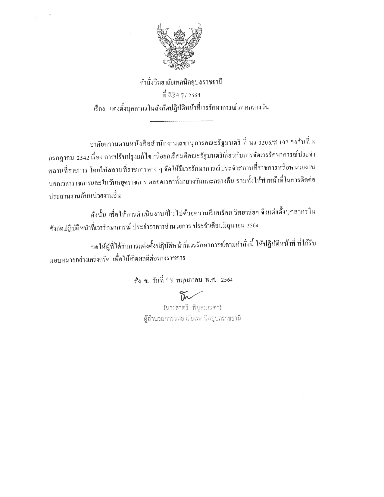 แต่งตั้งบุคคลากรในสังกัดปฏิบัติหน้าที่เวรรักษาการณ์ ภาคกลางวัน ประจำเดือนมิถุนายน 2564
