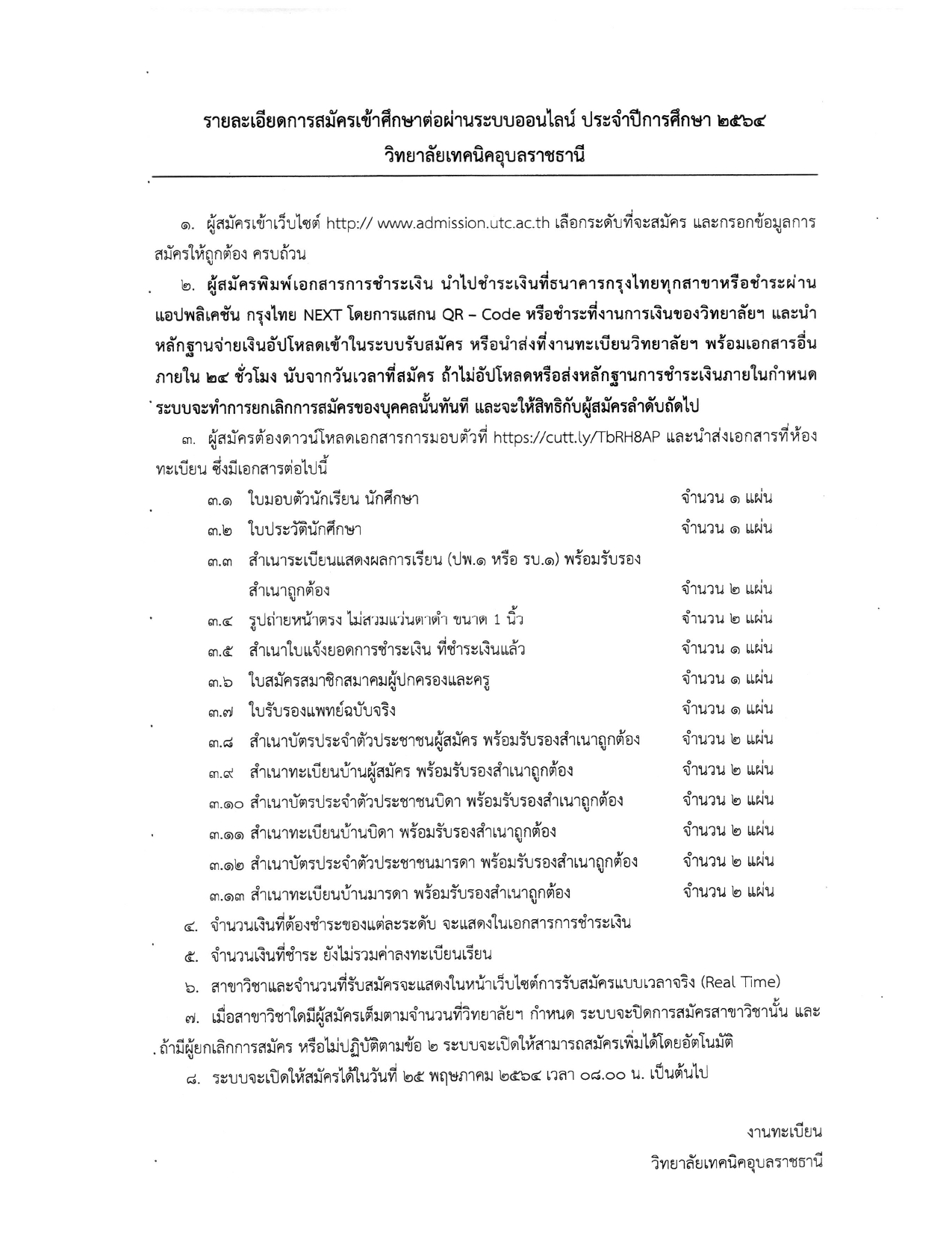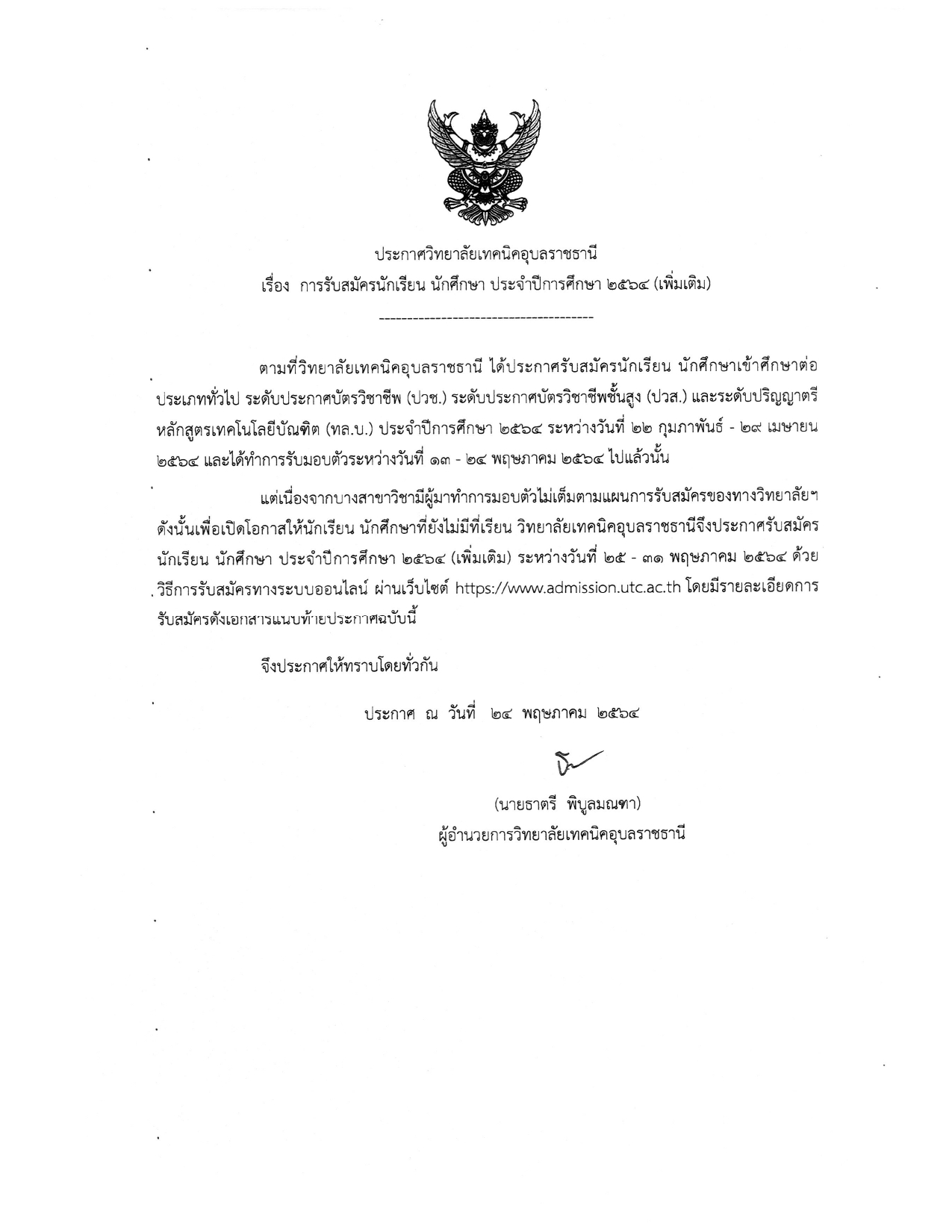 ประกาศวิทยาลัยเทคนิคอุบลราชธานี เรื่อง การรับสมัครนักเรียน นักศึกษา ประจำปีการศึกษา ๒๕๖๔ (เพิ่มเติม)