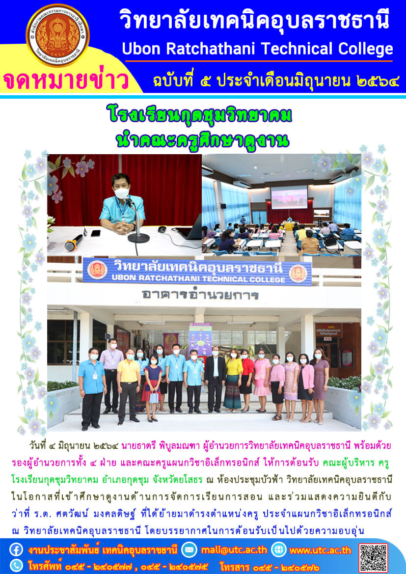 วันที่ ๔ มิถุนายน ๒๕๖๔ นายธาตรี พิบูลมณฑา ผู้อำนวยการวิทยาลัยเทคนิคอุบลราชธานี พร้อมด้วยรองผู้อำนวยการทั้ง ๔ ฝ่าย และคณะครูแผนกวิชาอิเล็กทรอนิกส์ ให้การต้อนรับ คณะผู้บริหาร ครูโรงเรียนกุดชุมวิทยาคม อำเภอกุดชุม จังหวัดยโสธร ณ ห้องประชุมบัวฟ้า วิทยาลัยเทคนิคอุบลราชธานี ในโอกาสที่เข้าศึกษาดูงานด้านการจัดการเรียนการสอน และร่วมแสดงความยินดีกับ ว่าที่ ร.ต. ศตวัฒน์ มงคลดิษฐ์ ที่ได้ย้ายมาดำรงตำแหน่งครู ประจำแผนกวิชาอิเล็กทรอนิกส์ ณ วิทยาลัยเทคนิคอุบลราชธานี โดยบรรยากาศในการต้อนรับเป็นไปด้วยความอบอุ่น