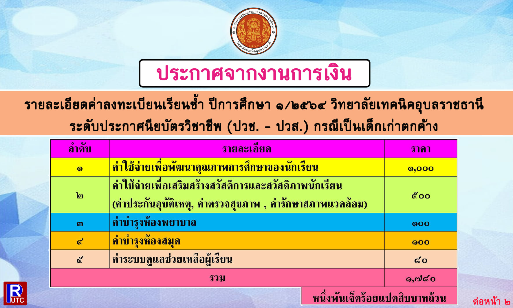 ประกาศจากงานการเงินรายละเอียดค่าลงทะเบียนเรียนซ้ำ ปีการศึกษา 1/2564 วิทยาลัยเทคนิคอุบลราชธานี ระดับประกาศนียบัตรวิชาชีพ ( ปวช. – ปวส.) กรณีเป็นเด็กเก่าตกค้าง