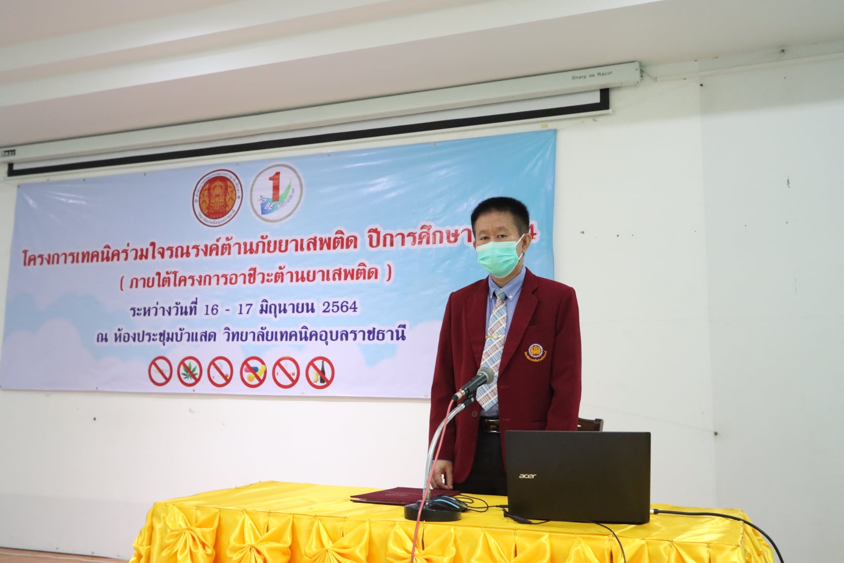 วันที่ ๑๖ มิถุนายน ๒๕๖๔ เวลา ๐๙.๓๐ น. นายมนตรี สุริยพันตรี รองผู้อำนวยการฝ่ายบริหารทรัพยากรวิทยาลัยเทคนิคอุบลราชธานี ให้เกียรติเป็นประธานในพิธีเปิดโครงการเทคนิคร่วมใจรณรงค์ต้านภัยยาเสพติด ปีการศึกษา ๒๕๖๔ (ภายใต้โครงการอาชีวะต้านยาเสพติด) จัดขึ้นระหว่างวันที่ ๑๖ – ๑๗ มิถุนายน ๒๕๖๔ ณ ห้องประชุมบัวแสด โดยมีวัตถุประสงค์เพื่อให้นักเรียน นักศึกษา ได้ตระหนักถึงผลกระทบของการเข้าไปเกี่ยวข้องกับยาเสพติด และให้รู้จักวิธีการหลีกเลี่ยงสารเสพติดทุกชนิด ทั้งนี้ตลอดการจัดกิจกรรมได้รับความอนุเคราะห์ จาก ด.ต.ณัชพล ผลคำเจริญ ตำแหน่ง ผู้บังคับบัญชาหมู่จราจร สถานีตำรวจภูธรวารินชำราบ เป็นวิทยากรบรรยายให้ความรู้ตลอดการจัดการอบรม