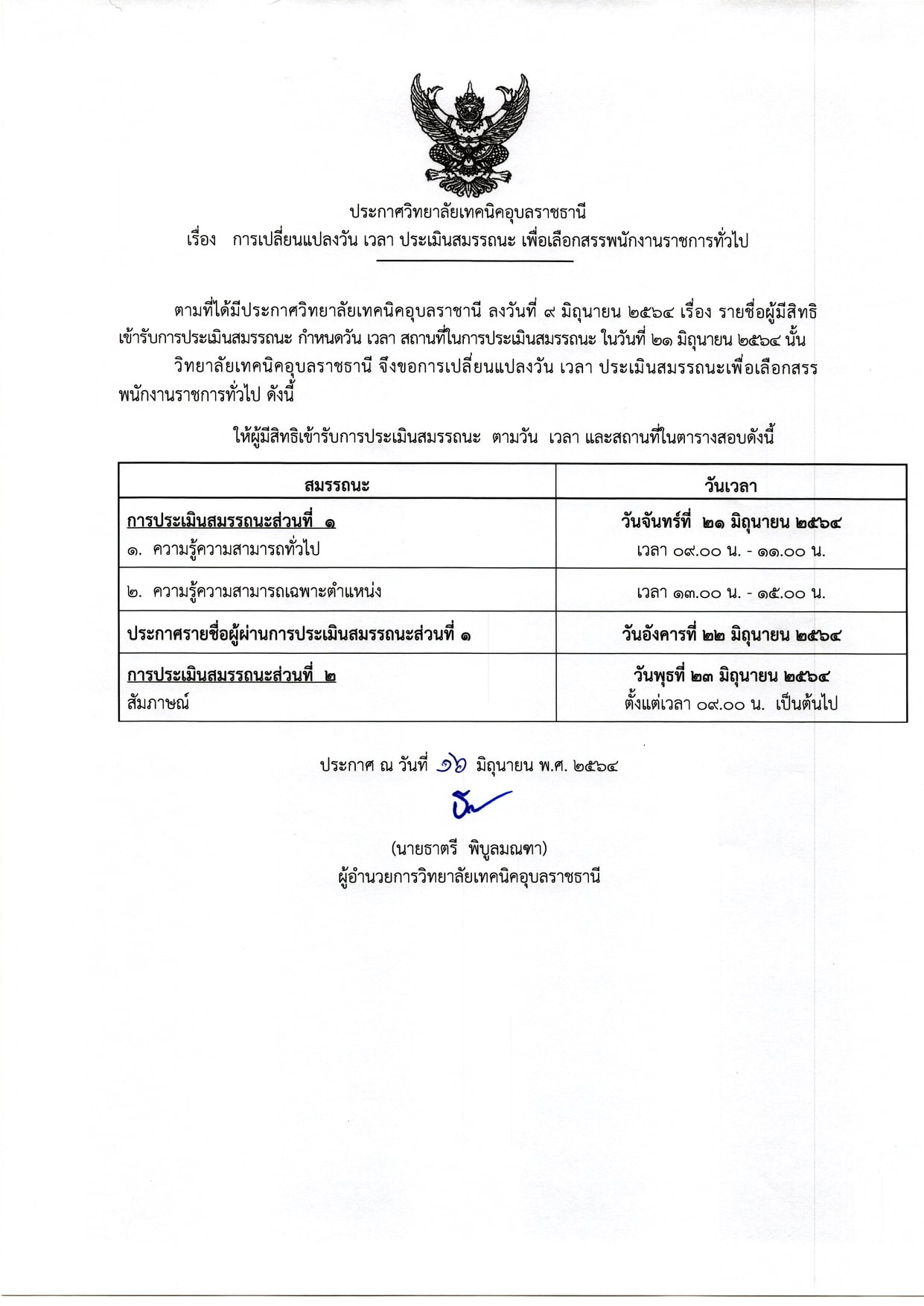 ประกาศวิทยาลัยเทคนิคอุบลราชธานี เรื่องการเปลี่ยนแปลงวัน เวลา ประเมินสมรรถนะเพื่อเลือกสรรพนักงานราชการทั่วไป