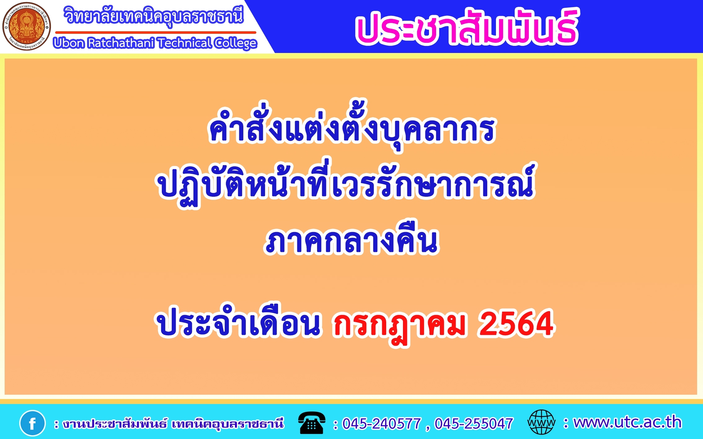 แต่งตั้งบุคคลากรในสังกัดปฏิบัติหน้าที่เวรรักษาการณ์ ภาคกลางคืน ประจำเดือนกรกฎาคม 2564