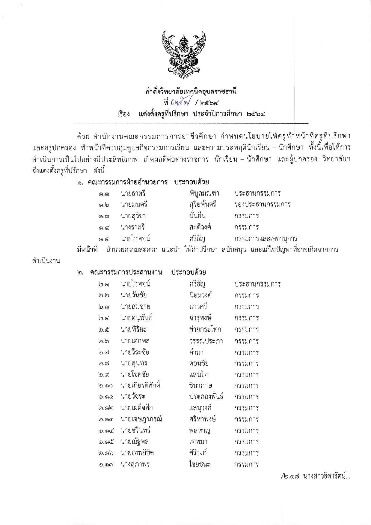 แต่งตั้งบุคลากรในสังกัดปฏิบัติหน้าที่เวรรักษาการณ์ ประจำเดือนมีนาคม 2564