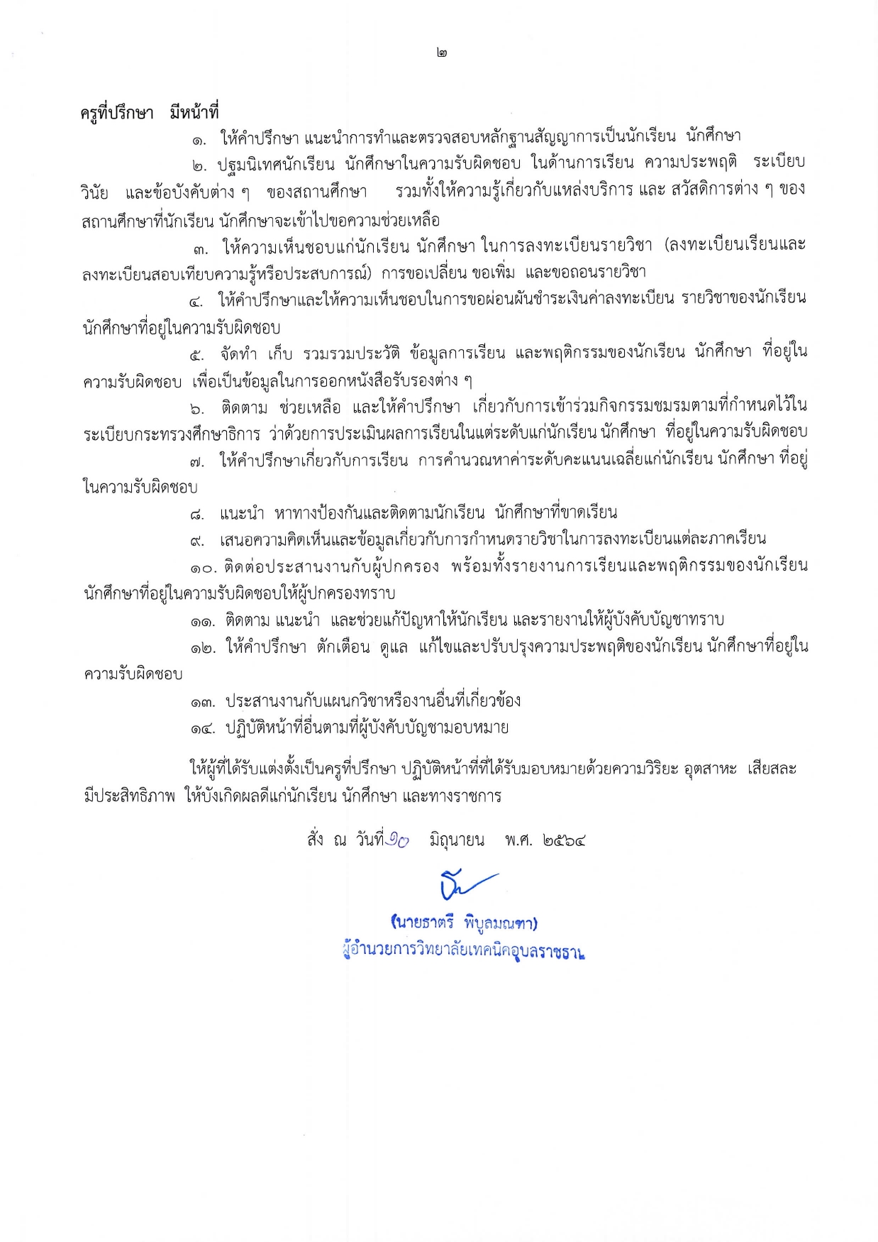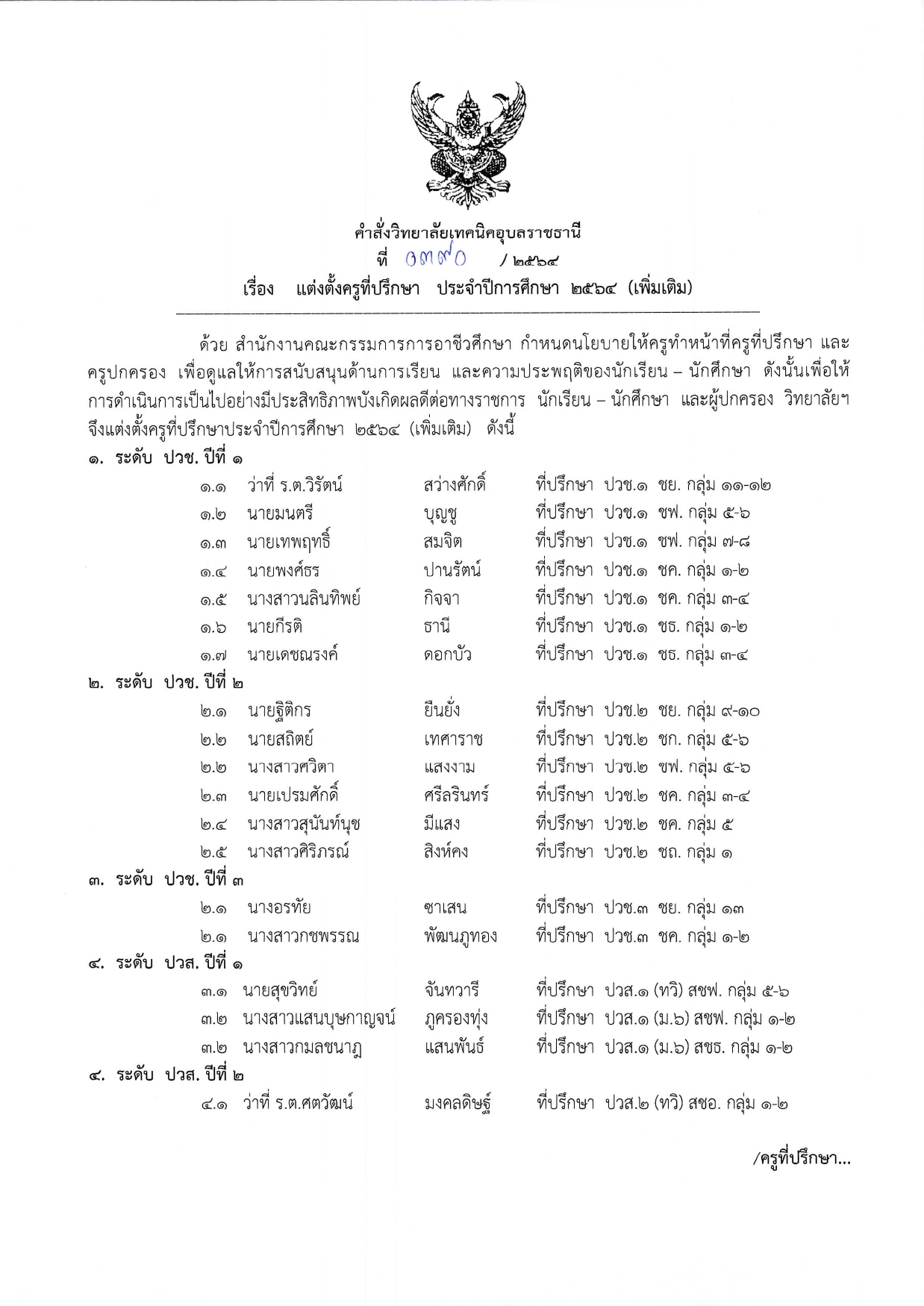 คำสั่งวิทยาลัยเทคนิคอุบลราชธานี เรื่อง แต่งคั้งและมอบหมายหน้าที่ ใหเบุคลากรในสถานศึกษาปฏิบัติหน้าที่รับผิดชอบ