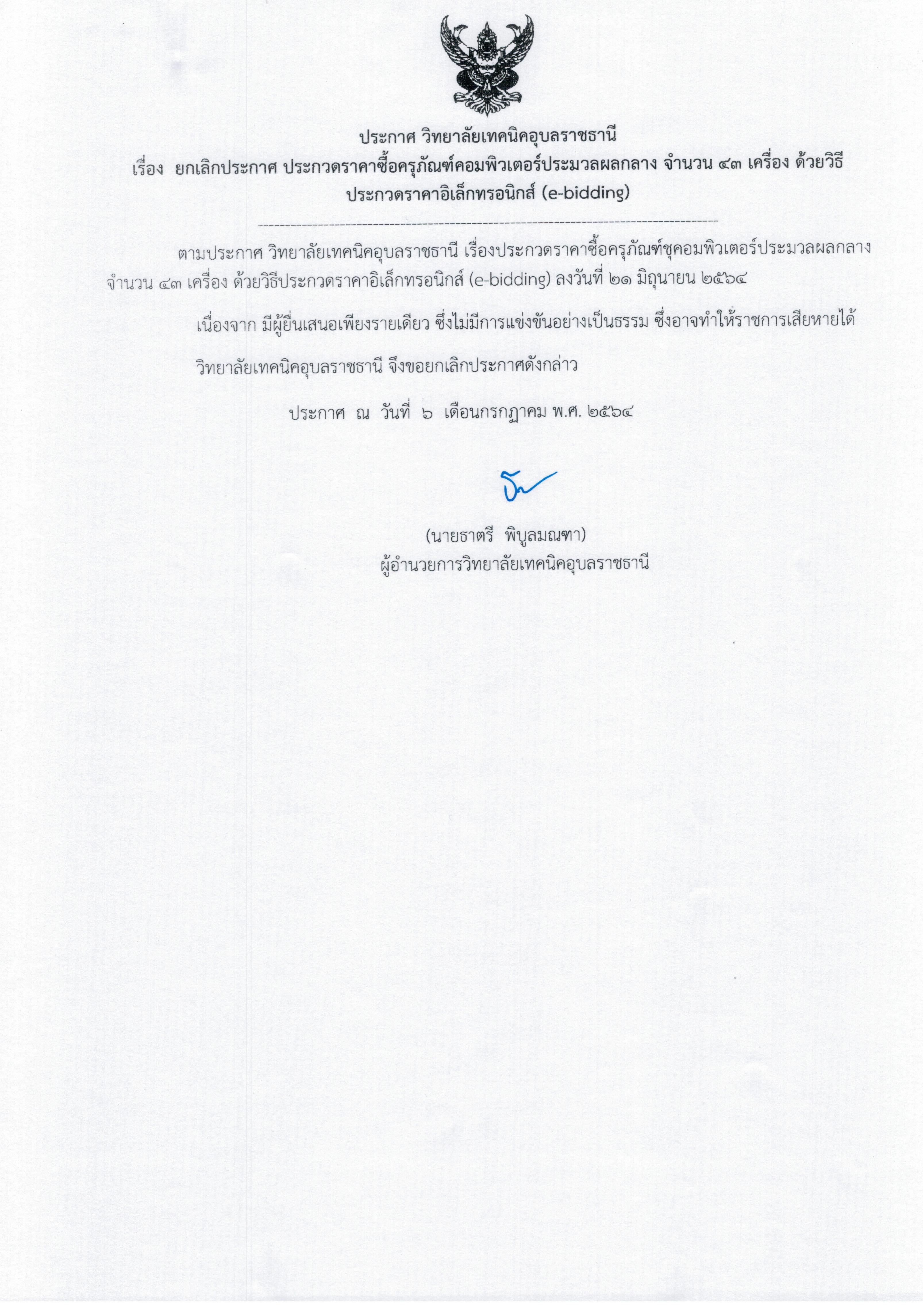 ยกเลิกประกาศประกวดราคาซื้อครุภัณฑ์คอมพิวเตอร์ประมวลผลกลาง จำนวน 43 เครื่อง ด้วยวิธีประกวดราคาอิเล็กทรอนิกส์ (e-bidding)