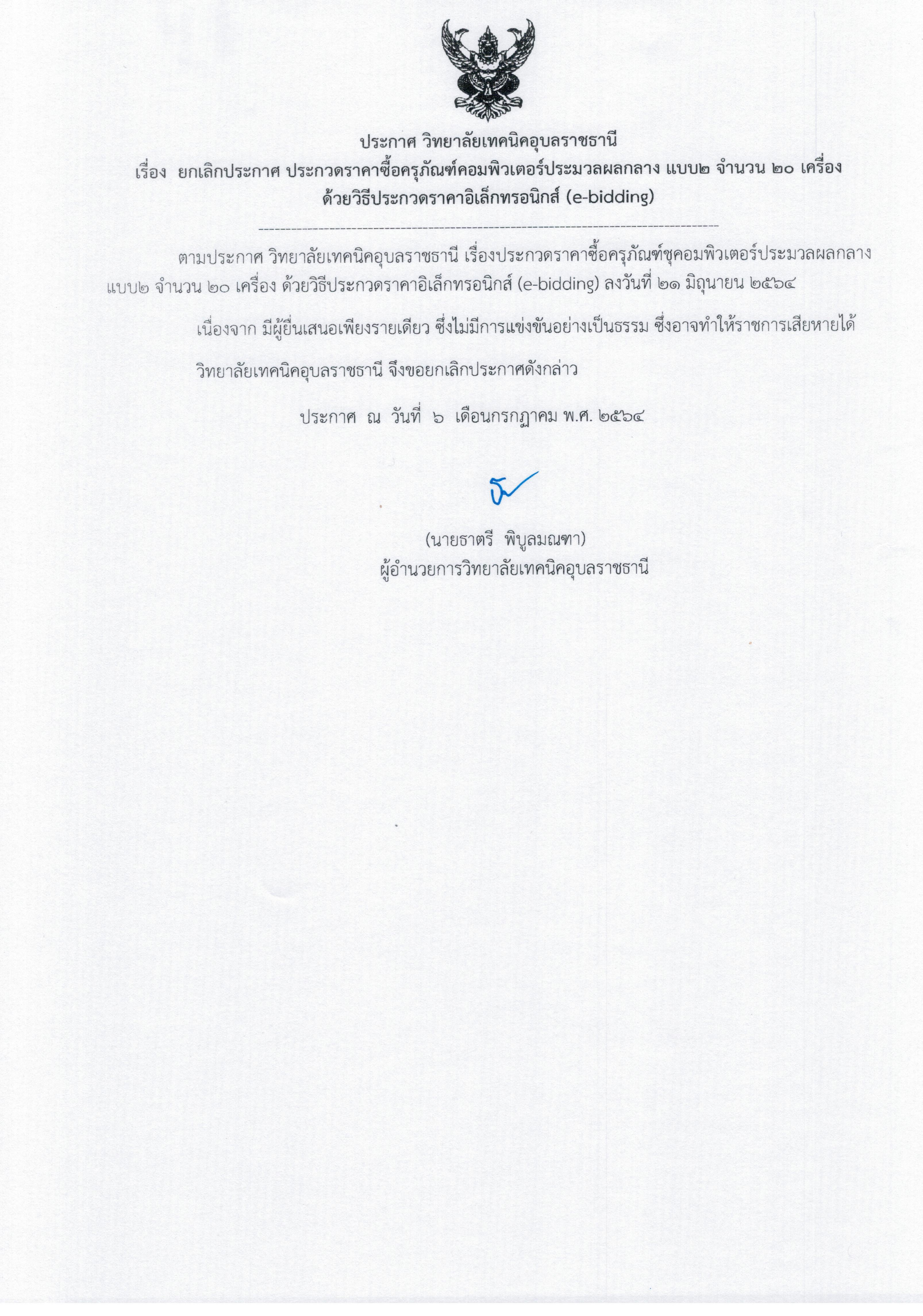 ยกเลิกประกาศประกวดราคาซื้อครุภัณฑ์คอมพิวเตอร์ประมวลผลกลางแบบ2 จำนวน 20 เครื่อง ด้วยวิธีประกวดราคาอิเล็กทรอนิกส์ (e-bidding)