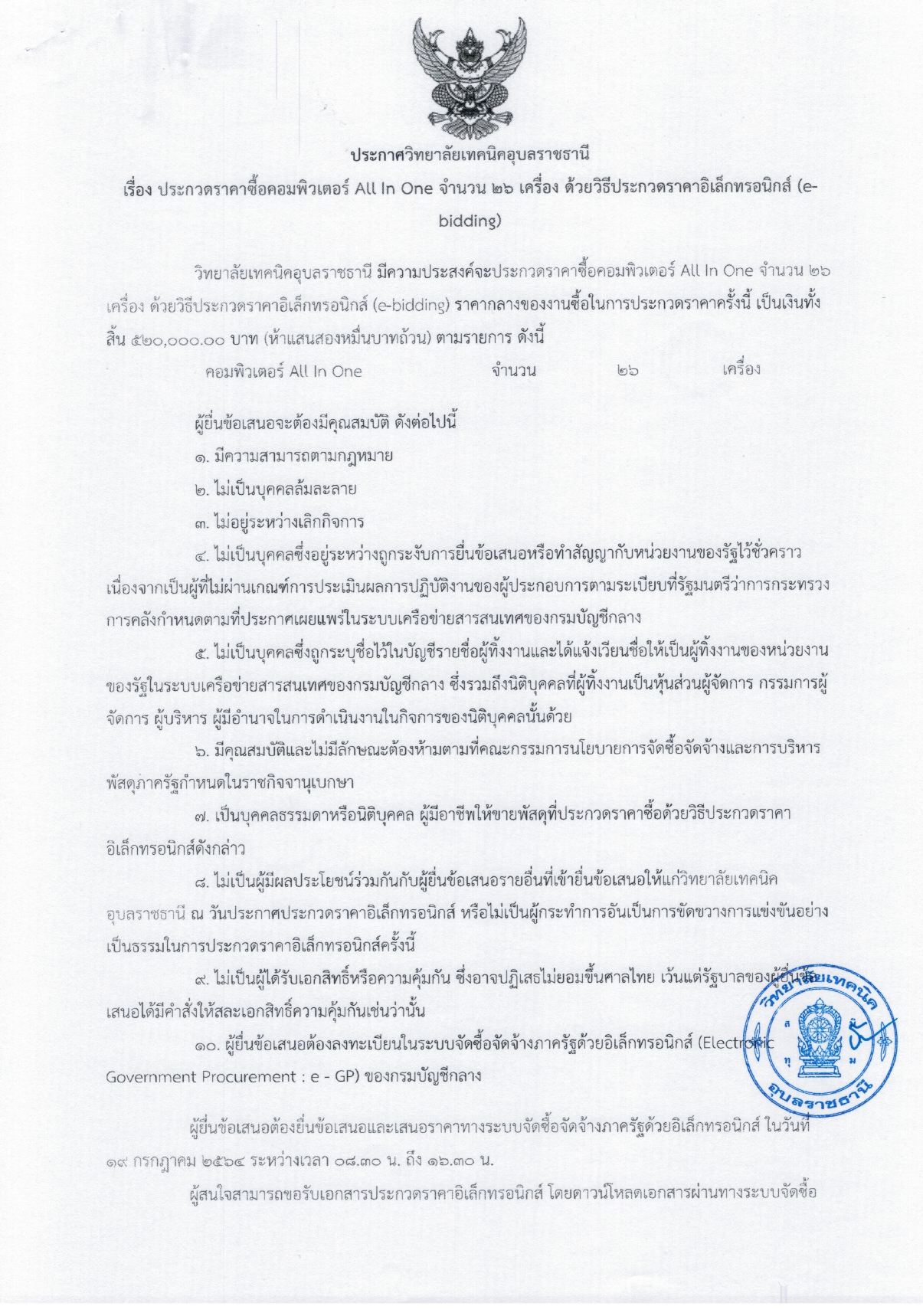 เรื่อง ประกวดราคาซื้อคอมพิวเตอร์ All In One จำนวน ๒๖ เครื่อง ด้วยวิธีประกวดราคาอิเล็กทรอนิกส์ (e-bidding)