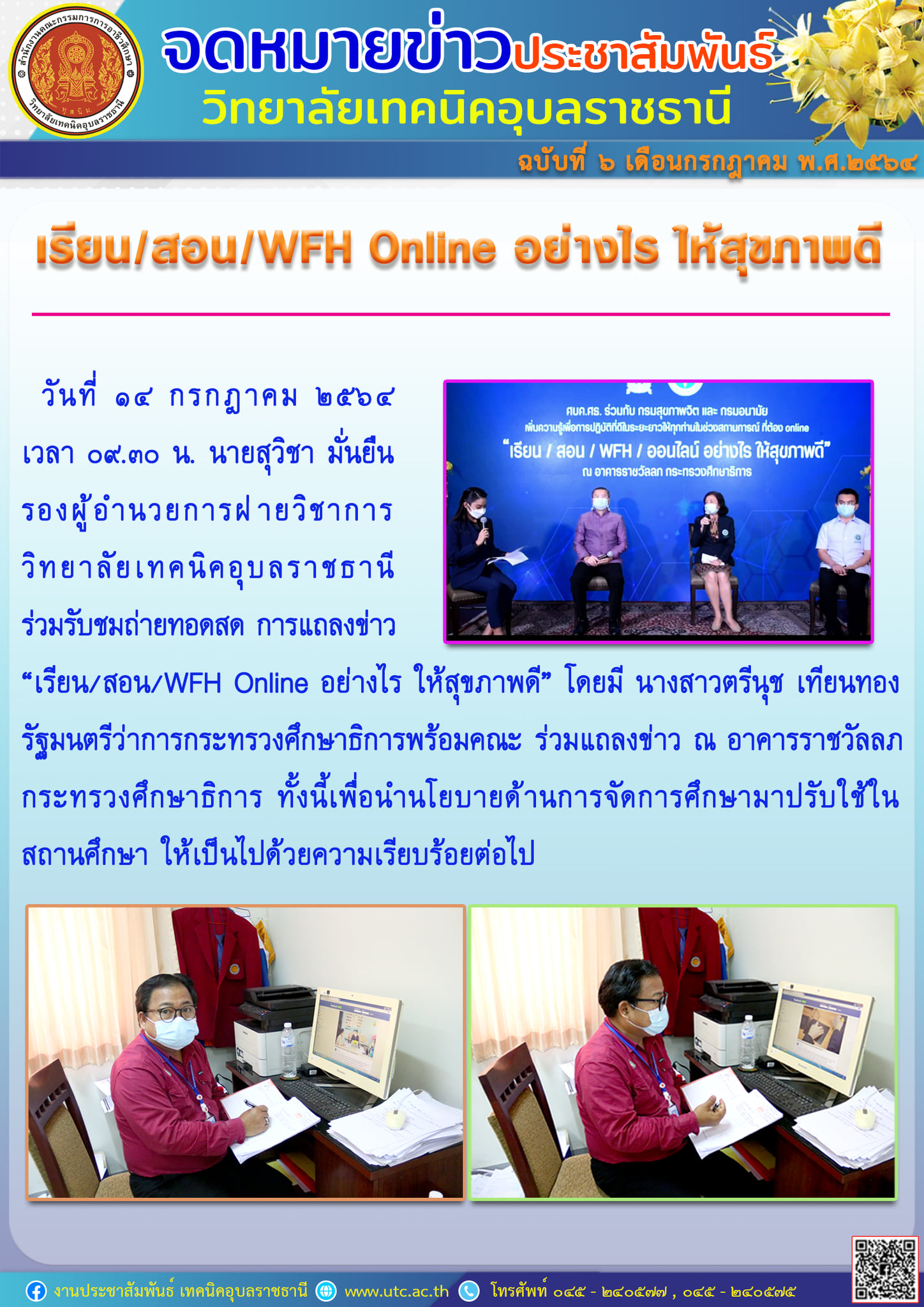 วันที่ ๑๔ กรกฎาคม ๒๕๖๔ เวลา ๐๙.๓๐ น. นายสุวิชา มั่นยืน รองผู้อำนวยการฝ่ายวิชาการ วิทยาลัยเทคนิคอุบลราชธานี ร่วมรับชมถ่ายทอดสด การแถลงข่าว “เรียน/สอน/WFH Online อย่างไร ให้สุขภาพดี”โดยมี นางสาวตรีนุช เทียนทอง รัฐมนตรีว่าการกระทรวงศึกษาธิการพร้อมคณะ ร่วมแถลงข่าว ณ อาคารราชวัลลภ กระทรวงศึกษาธิการ ทั้งนี้เพื่อนำนโยบายด้านการจัดการศึกษามาปรับใช้ในสถานศึกษา ให้เป็นไปด้วยความเรียบร้อยต่อไป