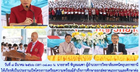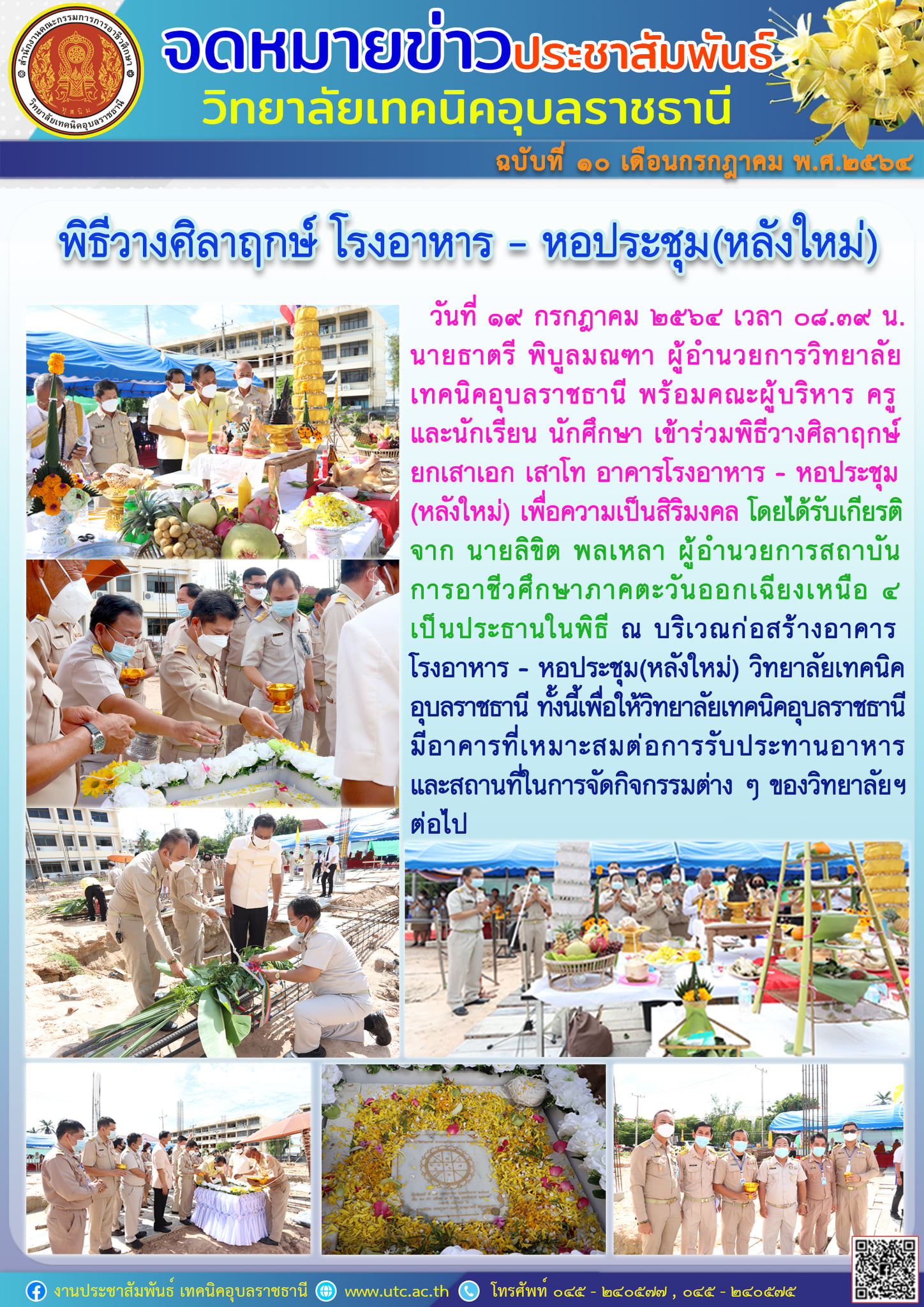 วันที่ ๑๙ กรกฎาคม ๒๕๖๔ เวลา ๐๘.๓๙ น. นายธาตรี พิบูลมณฑาผู้อำนวยการวิทยาลัยเทคนิคอุบลราชธานี พร้อมคณะผู้บริหาร ครู และนักเรียน นักศึกษา เข้าร่วมพิธีวางศิลาฤกษ์ ยกเสาเอก เสาโท อาคารโรงอาหาร – หอประชุม (หลังใหม่) เพื่อความเป็นสิริมงคล โดยได้รับเกียรติจาก นายลิขิต พลเหลา ผู้อำนวยการสถาบันการอาชีวศึกษาภาคตะวันออกเฉียงเหนือ ๔ เป็นประธานในพิธี ณ บริเวณก่อสร้างอาคาร โรงอาหาร – หอประชุม (หลังใหม่) วิทยาลัยเทคนิคอุบลราชธานี ทั้งนี้เพื่อให้วิทยาลัยเทคนิคอุบลราชธานี มีอาคารที่เหมาะสมต่อการรับประทานอาหารและสถานที่ในการจัดกิจกรรมต่าง ๆ ของวิทยาลัยฯ ต่อไป