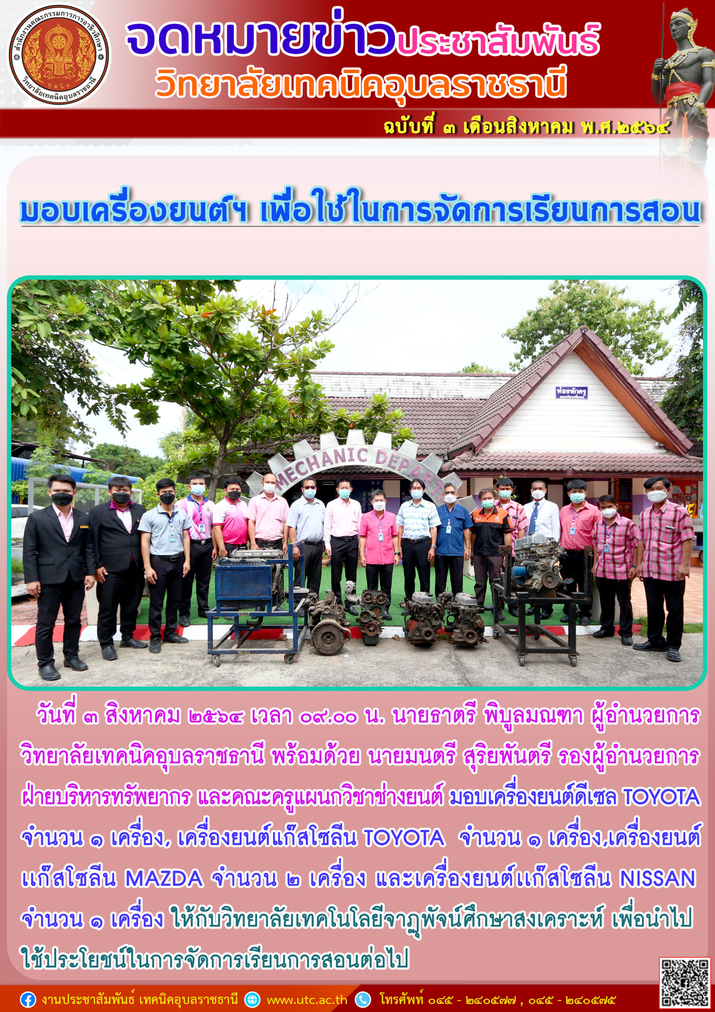 วันที่ ๓ สิงหาคม ๒๕๖๔ เวลา ๐๙.๐๐ น. นายธาตรี พิบูลมณฑาผู้อำนวยการวิทยาลัยเทคนิคอุบลราชธานี พร้อมด้วย นายมนตรี สุริยพันตรี รองผู้อำนวยการฝ่ายบริหารทรัพยากร และคณะครูแผนกวิชาช่างยนต์ มอบเครื่องยนต์ดีเซล TOYOTA จำนวน ๑ เครื่อง, เครื่องยนต์แก๊สโซลีน TOYOTA จำนวน ๑ เครื่อง,เครื่องยนต์เเก๊สโซลีน MAZDA จำนวน ๒ เครื่อง และเครื่องยนต์เเก๊สโซลีน NISSAN จำนวน ๑ เครื่อง ให้กับวิทยาลัยเทคโนโลยีจาฏุพัจน์ศึกษาสงเคราะห์ เพื่อนำไปใช้ประโยชน์ในการจัดการเรียนการสอนต่อไป